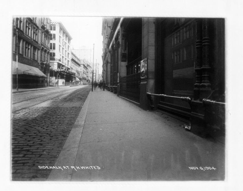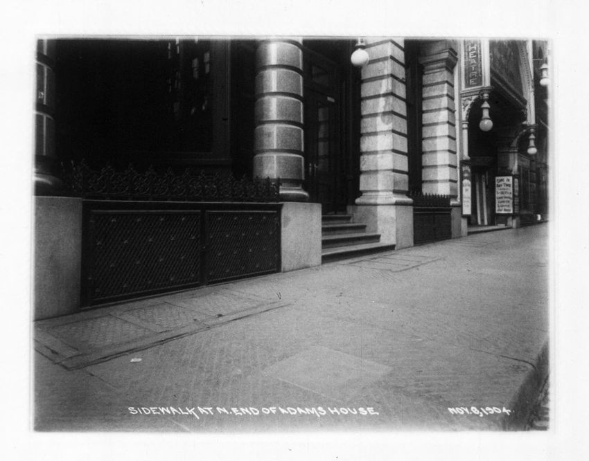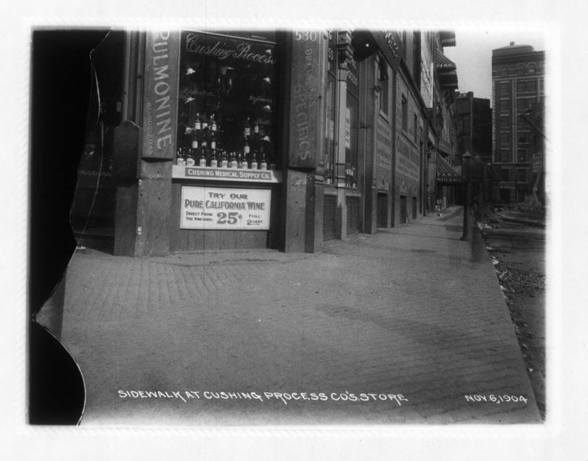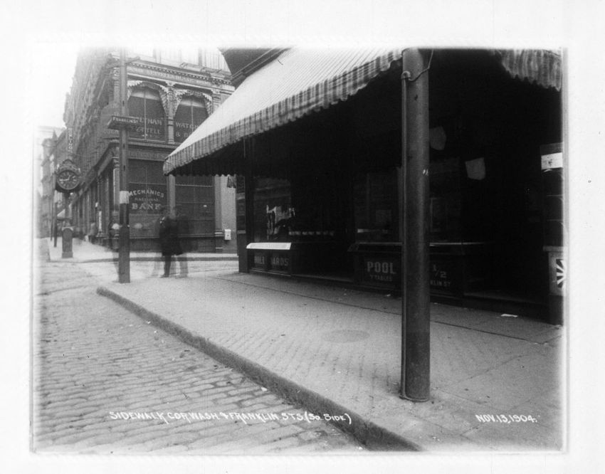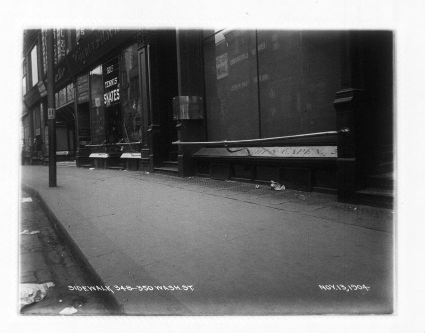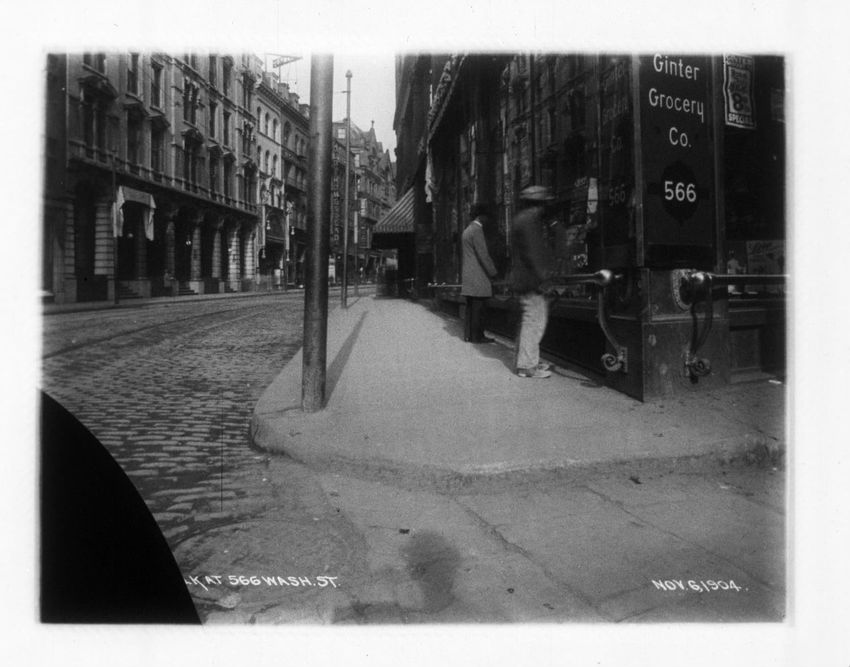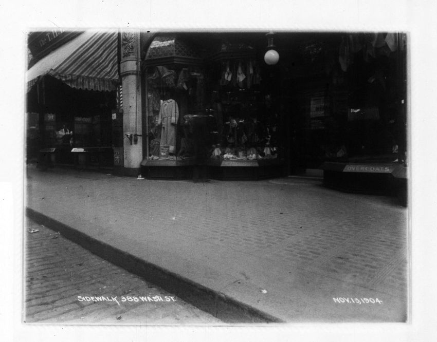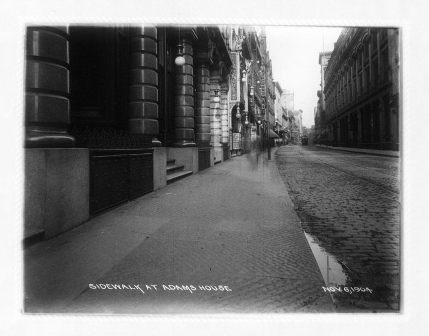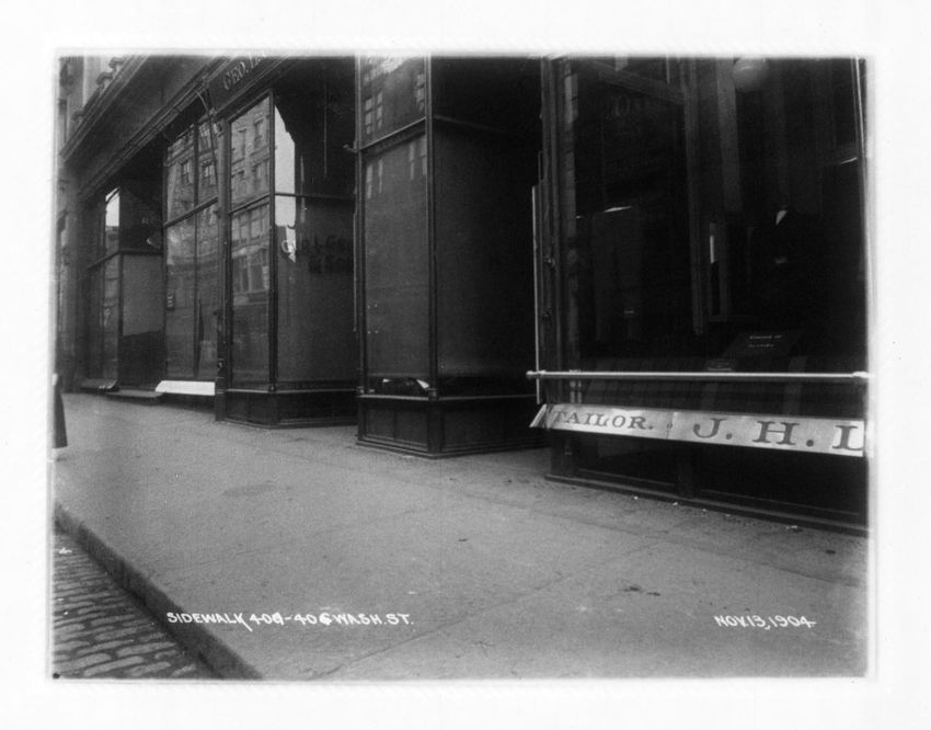 The Old South Meeting House can be seen on the upper left side of the image at the intersection of Milk and Washington Streets. The businesses on the right side of the image are the Boston Transcript, the Santa Fe Railroad ticket office and the Hobbs & Warren stationery shop. Wardell's restaurant, a...