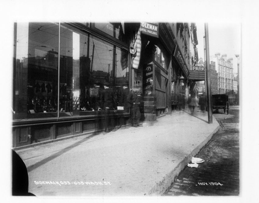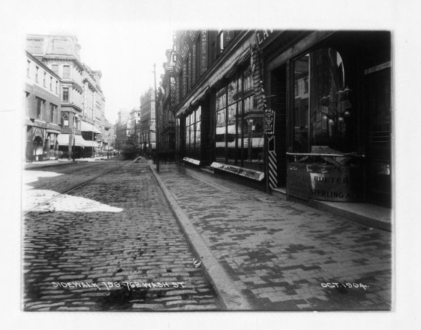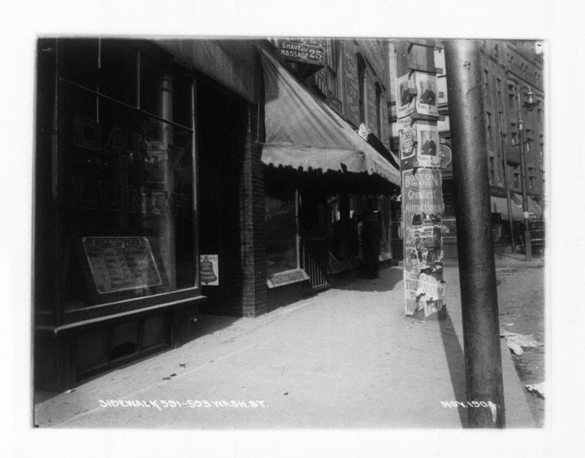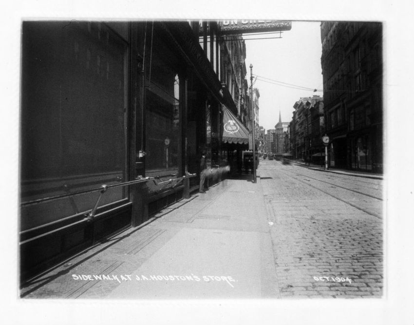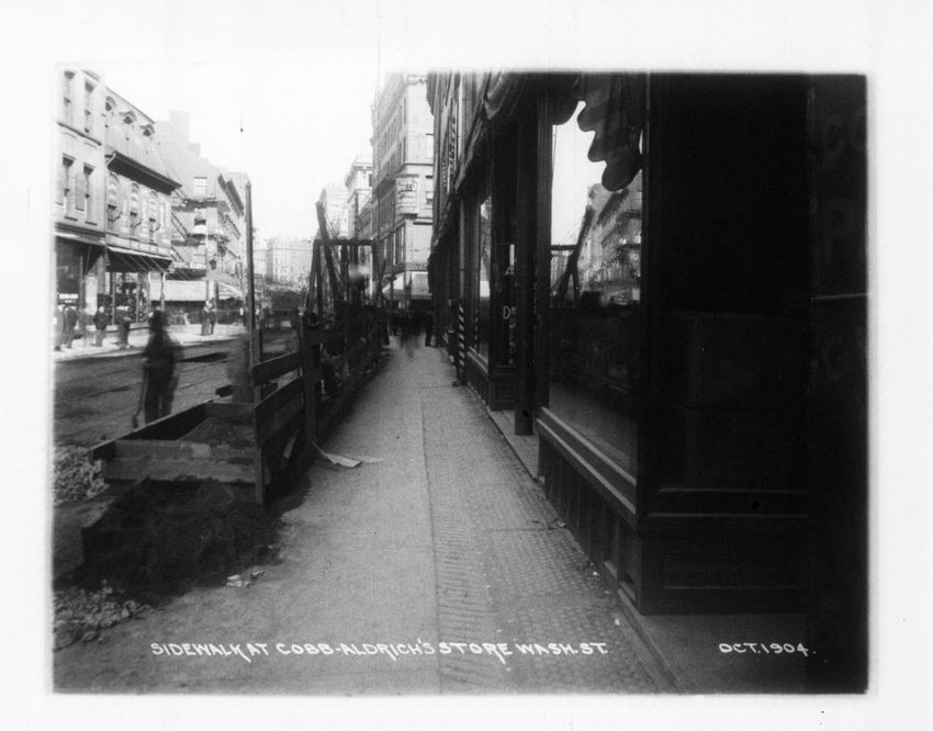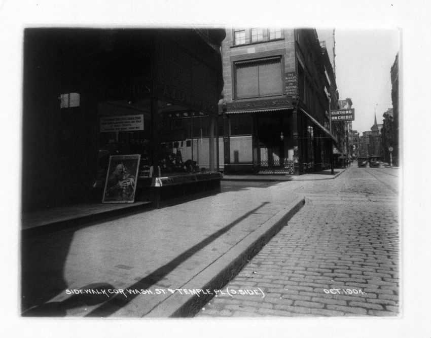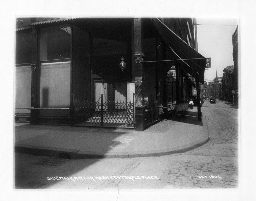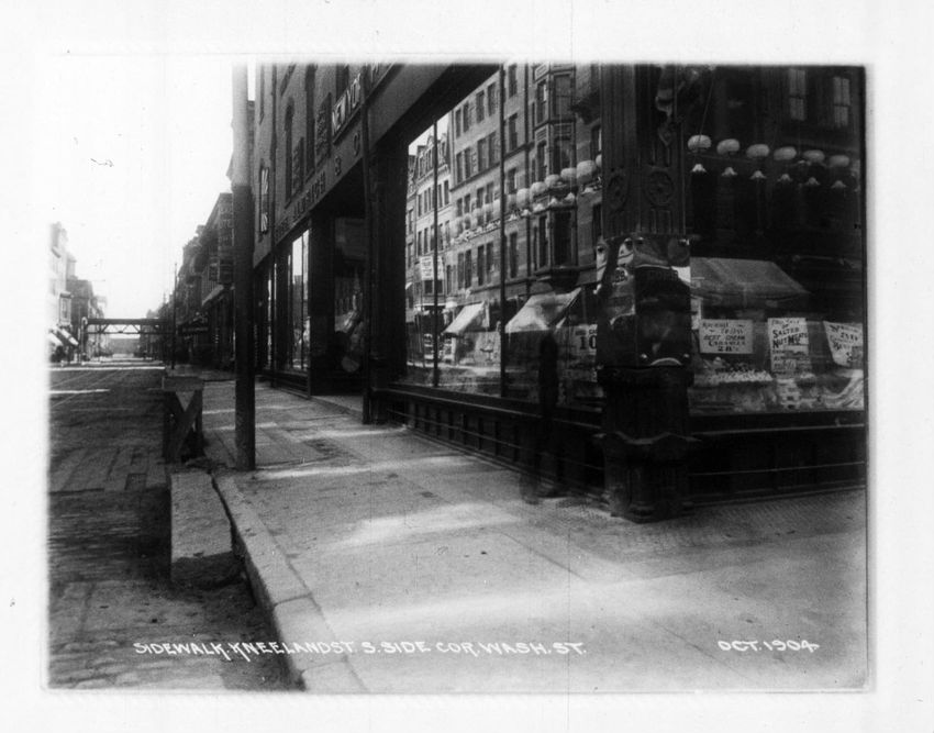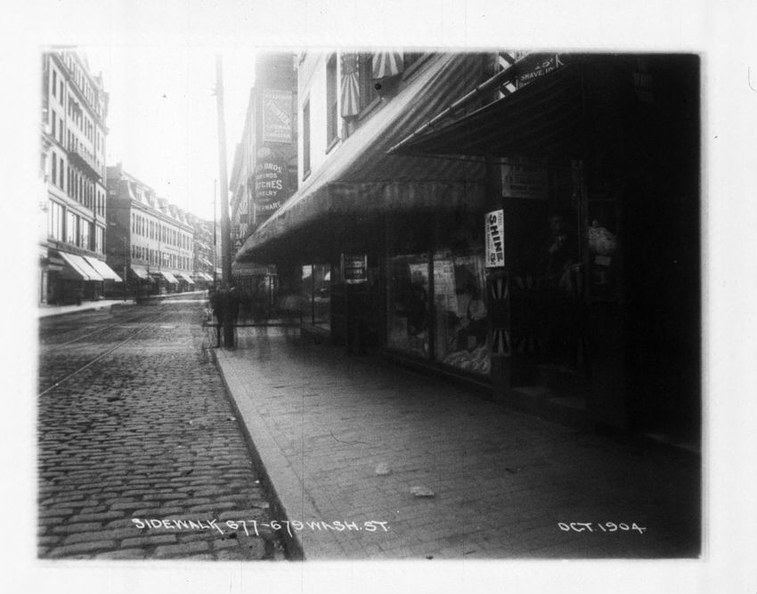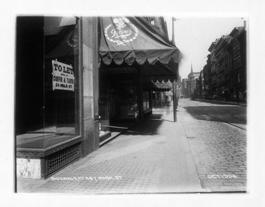 The Rogers Building with store fronts is seen. Just beyond it on the left side is the light colored Sears Building. The next building on the left, on the other side of the intersection is the Ames Building. Across from the Sears Building, in shadow, is the Old State House.