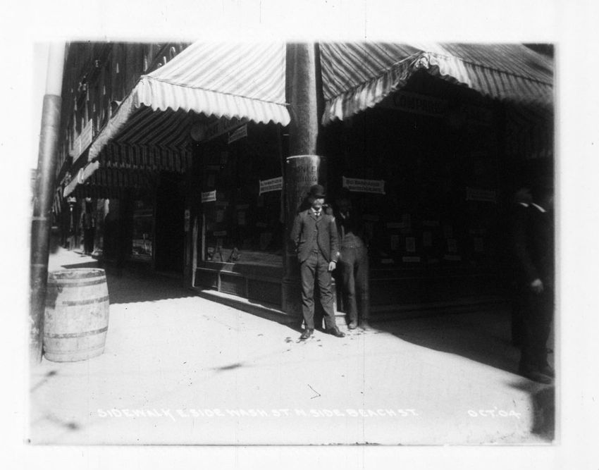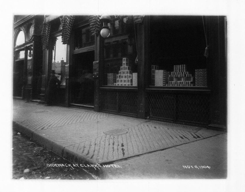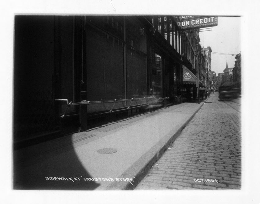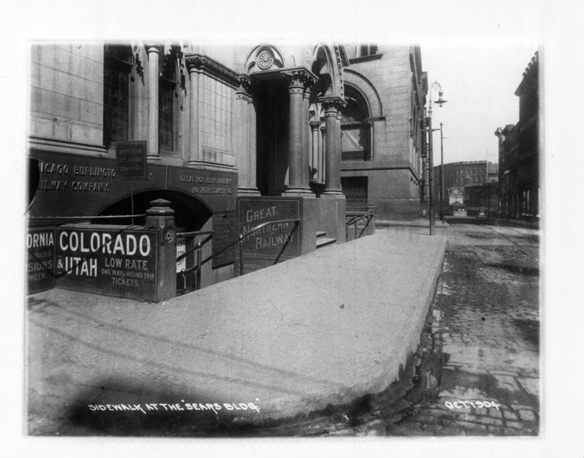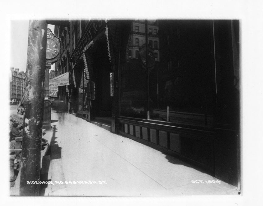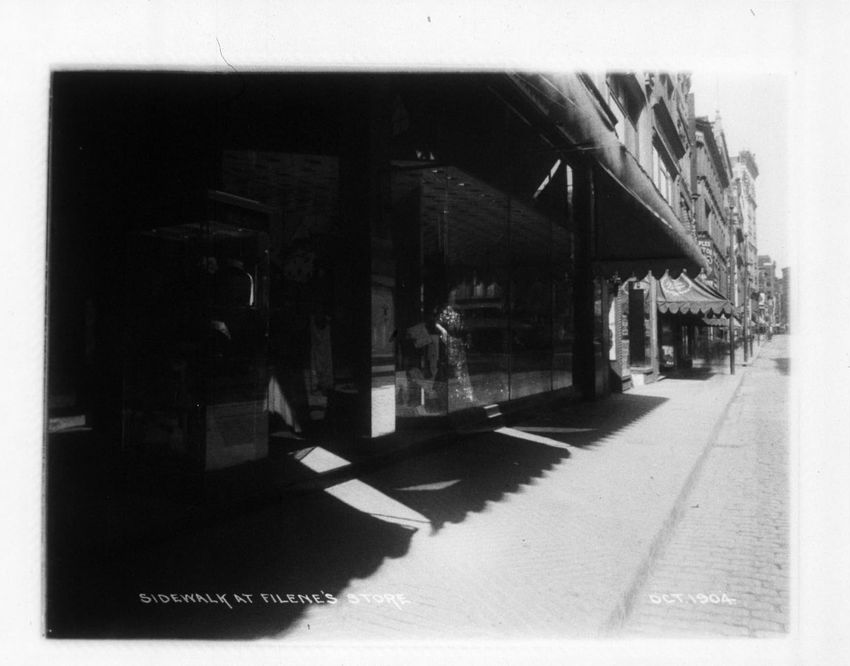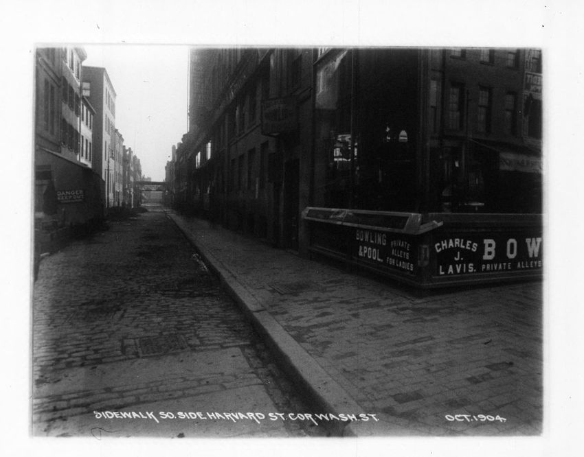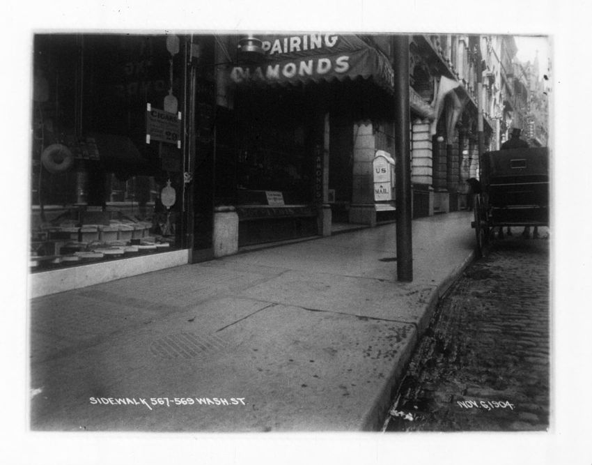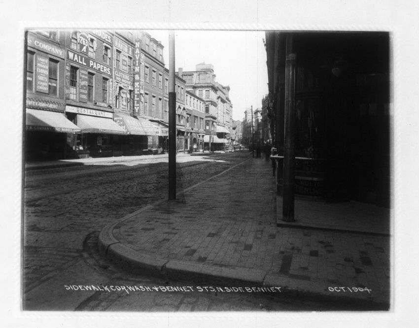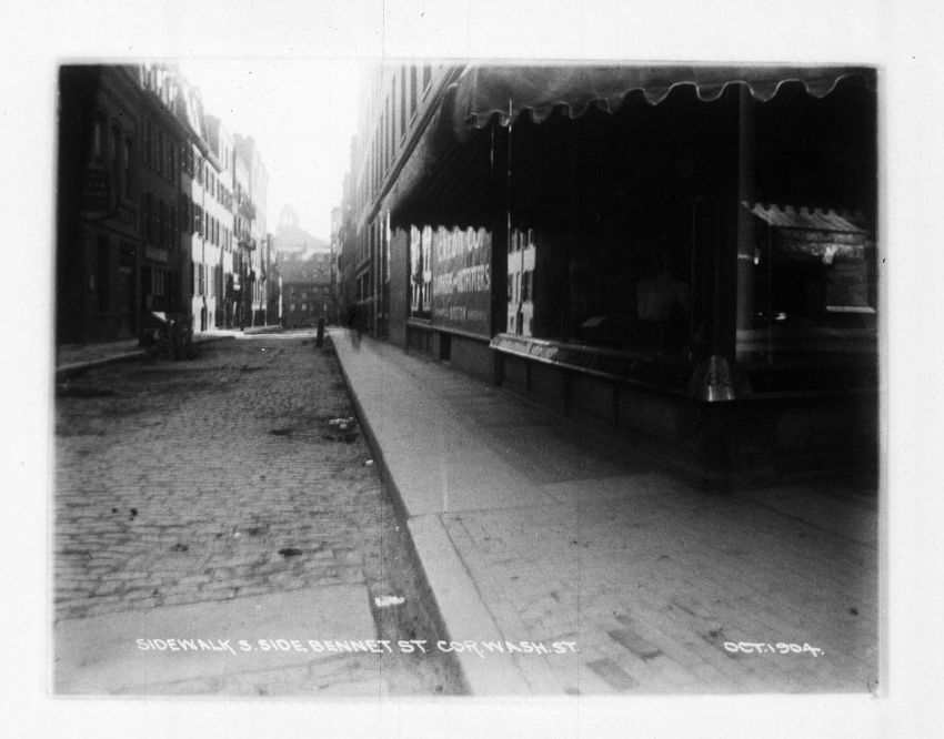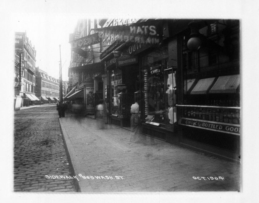 The Rogers Building with store fronts is seen. Just beyond it on the left side is the light colored Sears Building. The next building on the left, on the other side of the intersection is the Ames Building. Across from the Sears Building, in shadow, is the Old State House.