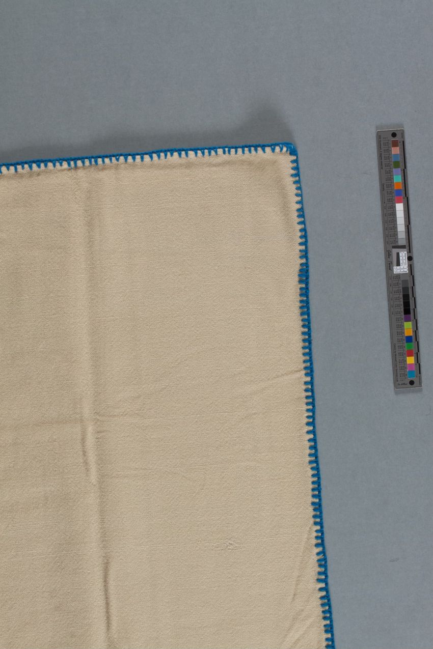 Rectangular, cream-colored plain weave wool blanket with narrow light blue stripe across end. Three light blue "points" along one edge; selvage sides, frayed end with cut edge.