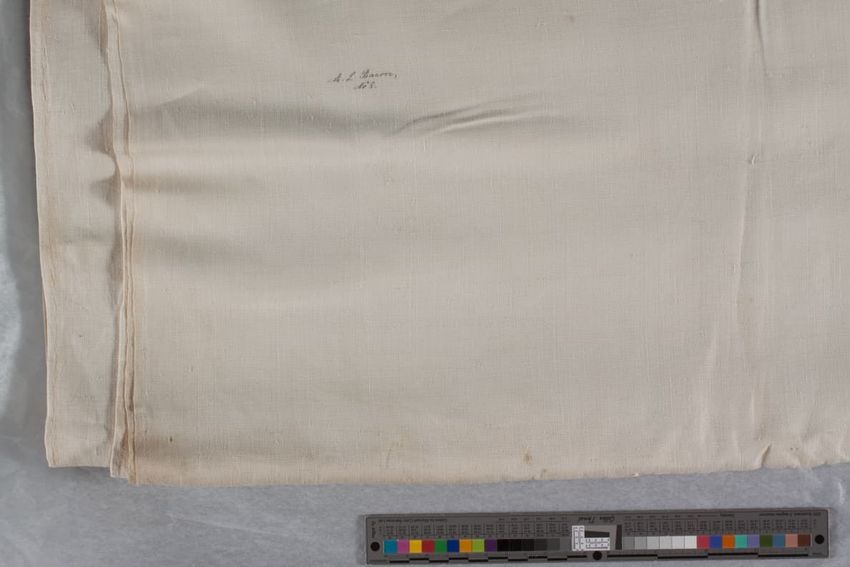 Rectangular, off-white linen sheet, hemmed top and bottom with selvage sides.