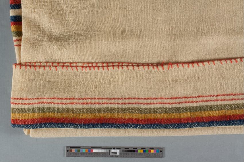 White, plain weave wool with band of rainbow-like stripes at each end: (from inside to out) blue, red, yellow, green with two narrow red stripes; ends finished off with red blanket stitch; sides selvage.