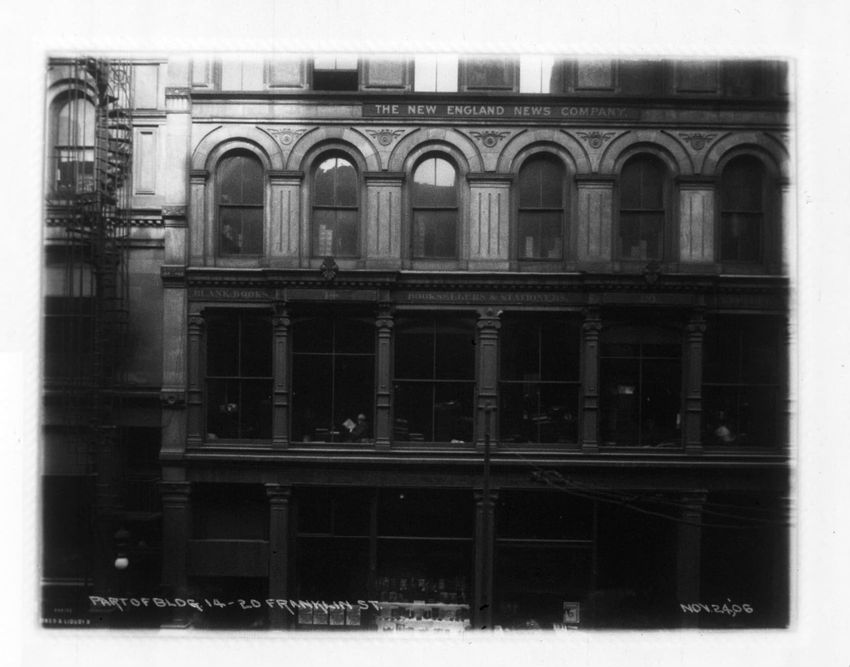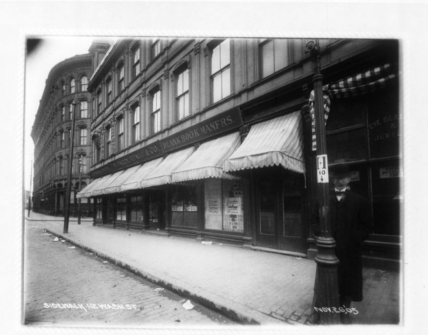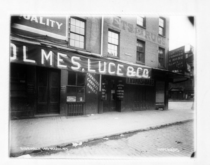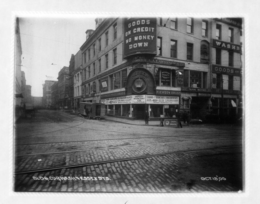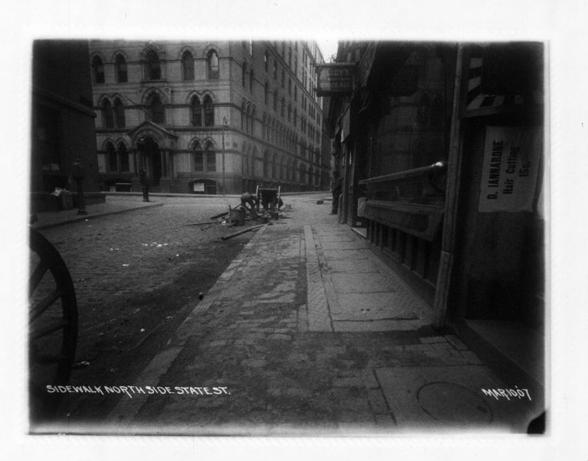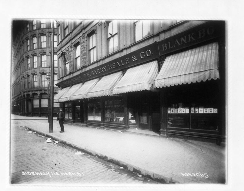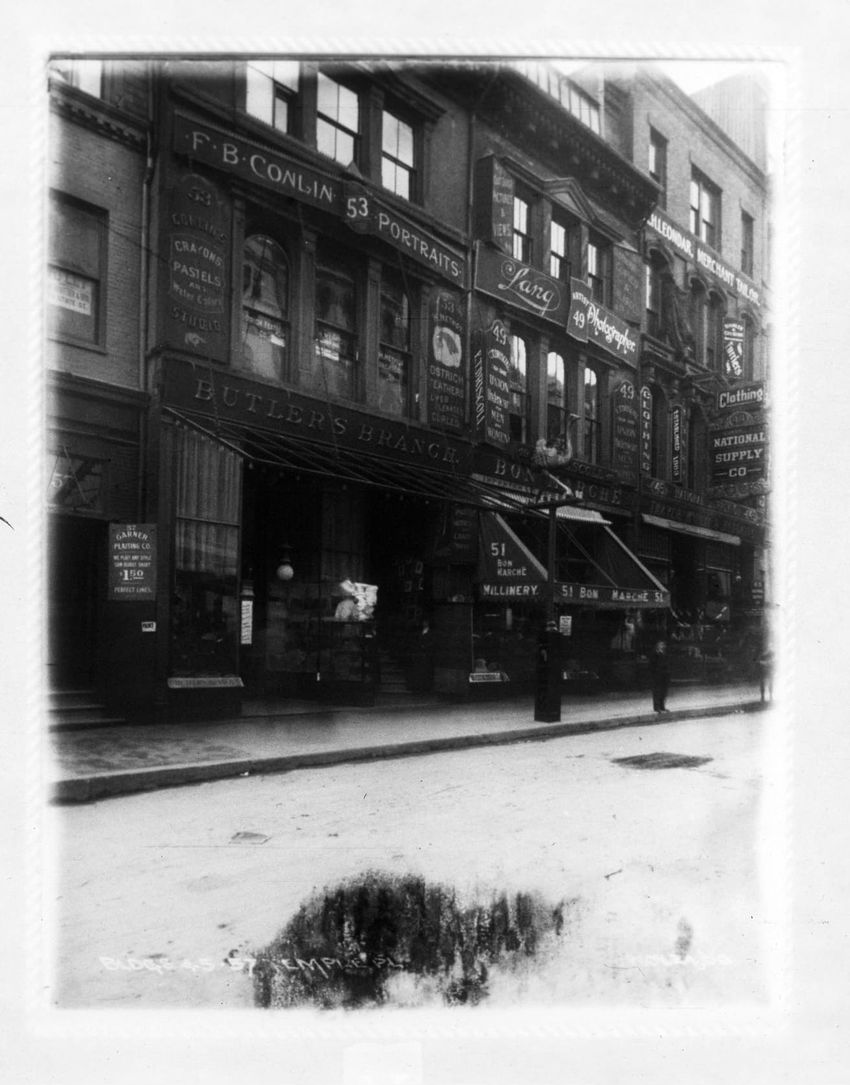 F.B. Conlin, portraits, photography studio is on the second floor at 53 Temple Place above the Butler Branch department store. The Bon Marche Millinery store is to the right at 51 Temple Place. Lang, photographer, is on the second floor at 49 Temple Place. On the left side of the image is the Garne...
