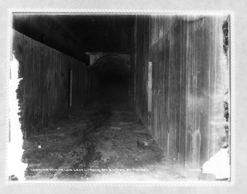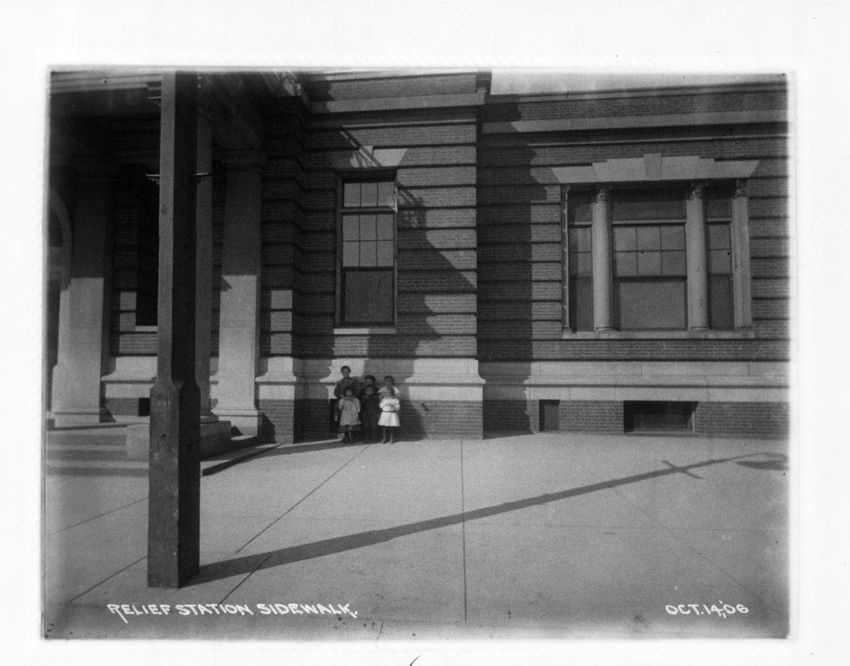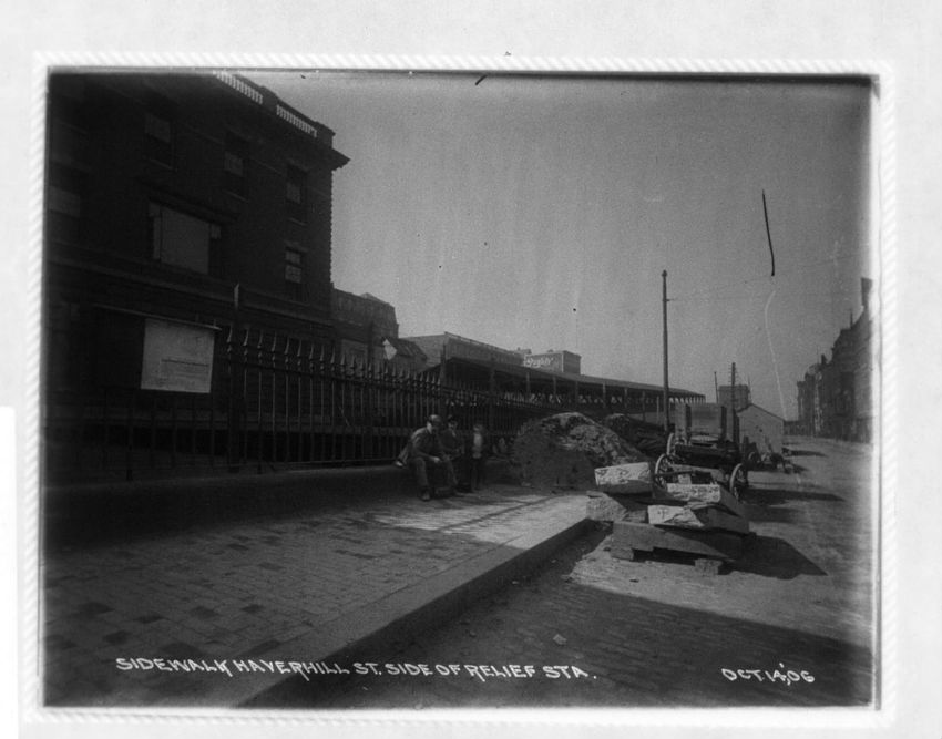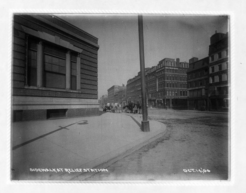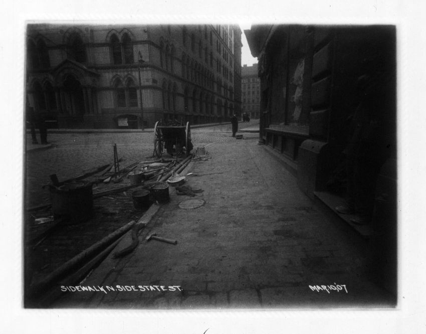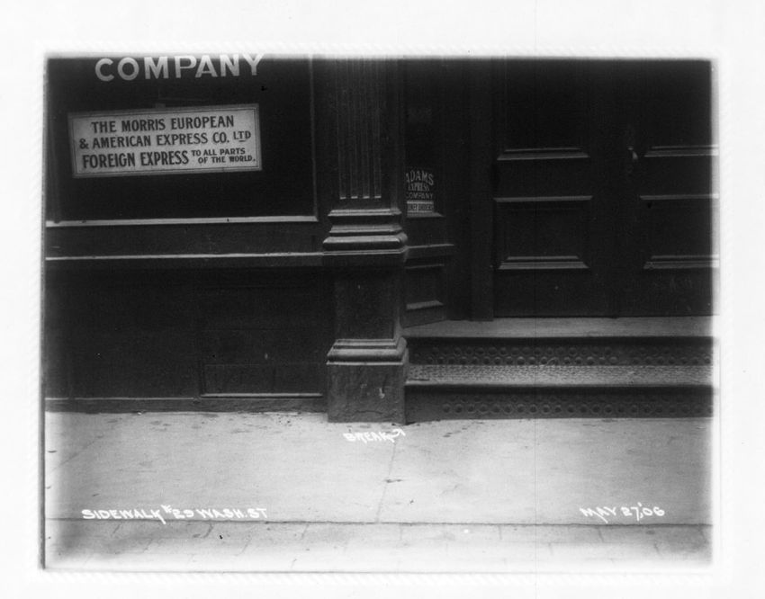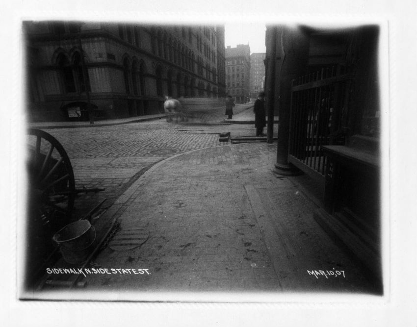 F.B. Conlin, portraits, photography studio is on the second floor at 53 Temple Place above the Butler Branch department store. The Bon Marche Millinery store is to the right at 51 Temple Place. Lang, photographer, is on the second floor at 49 Temple Place. On the left side of the image is the Garne...