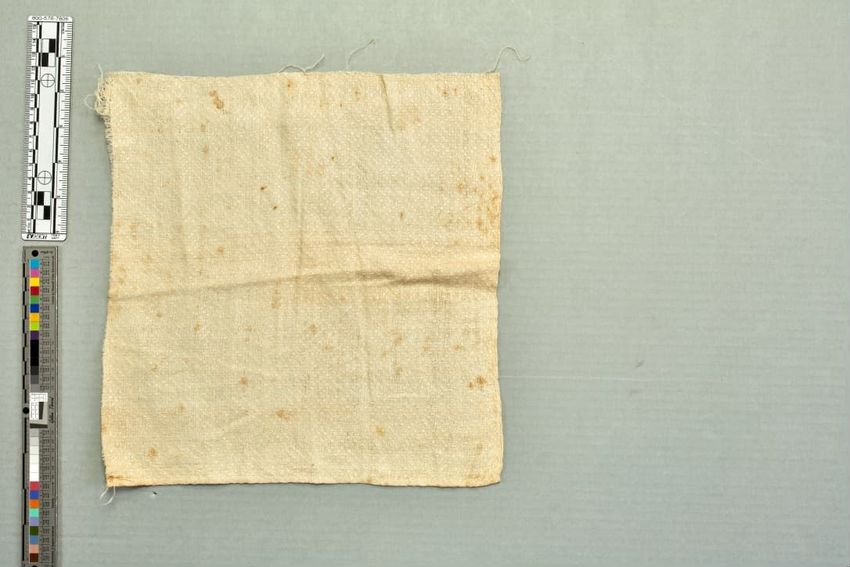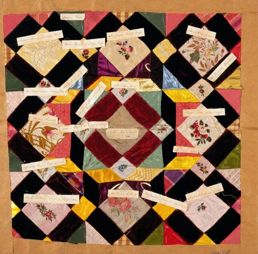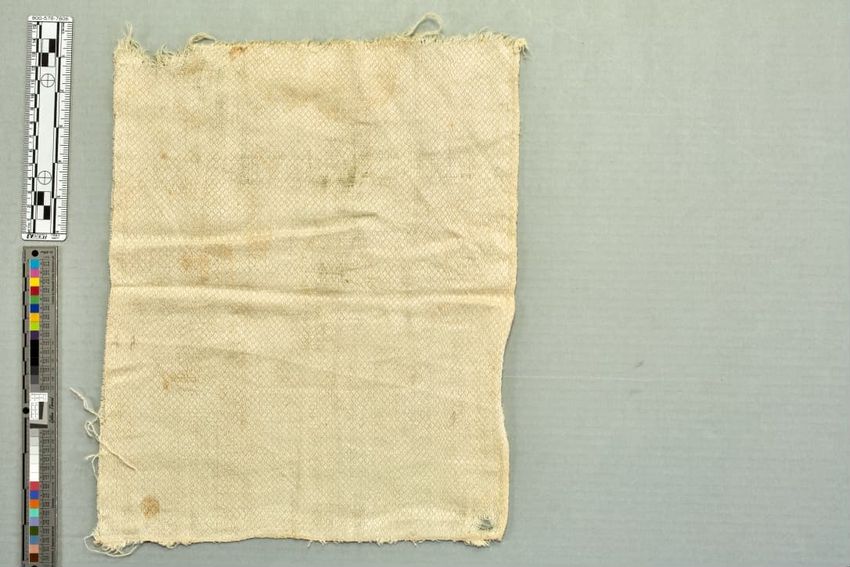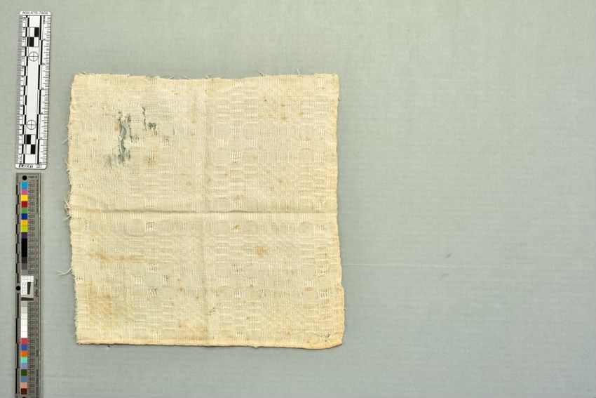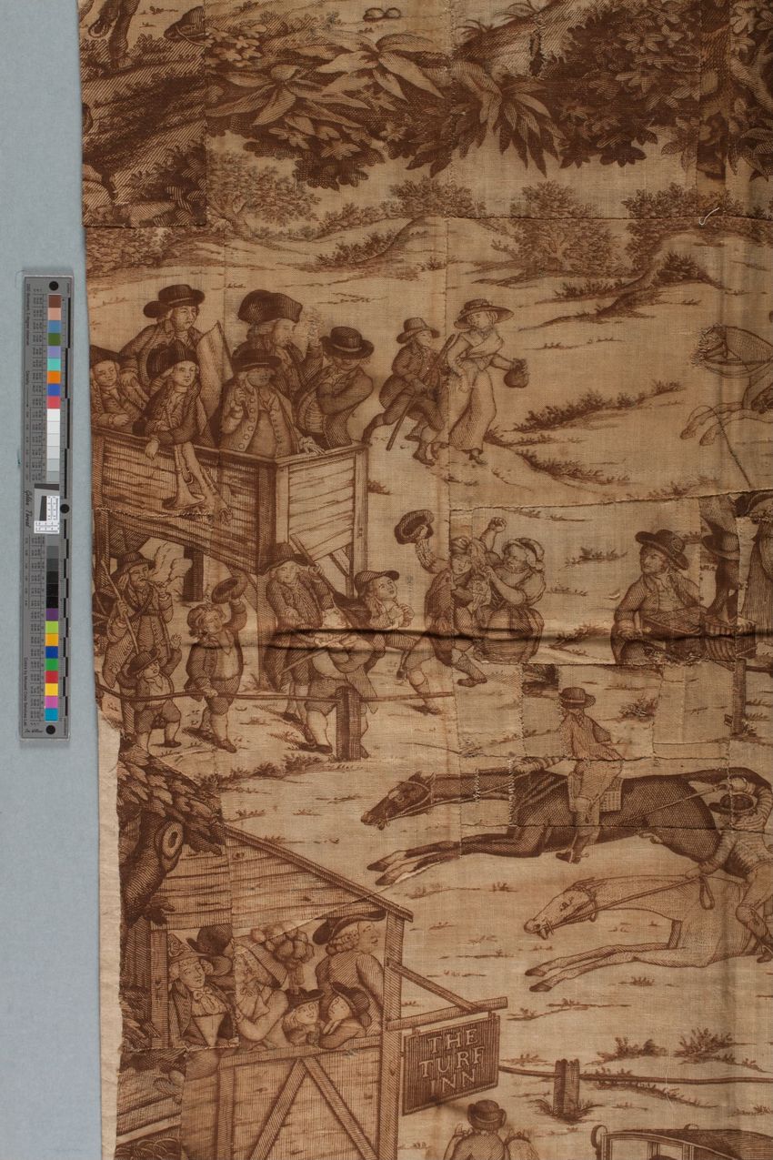 copper engraving (printing process), cotton (textile), fringe, hand weaving, linen (material), machine sewing (technique), net (textile), piecing, tabby (textile), alteration (process and technique), toile (textile material)