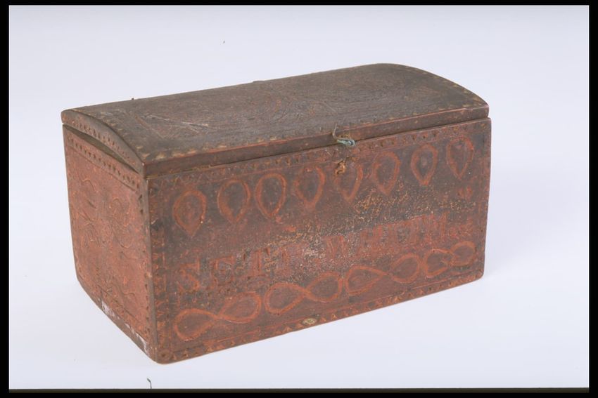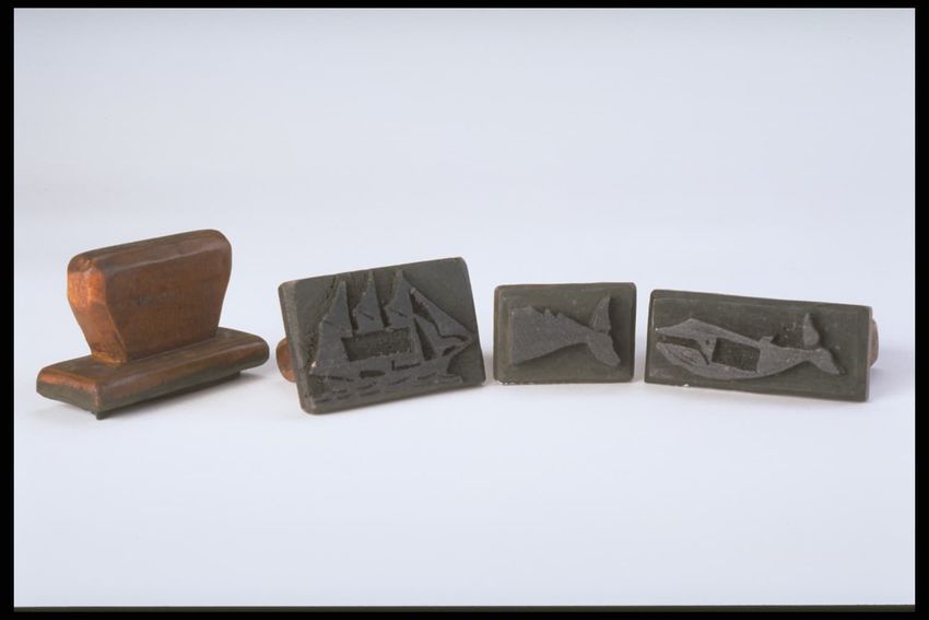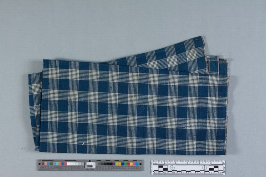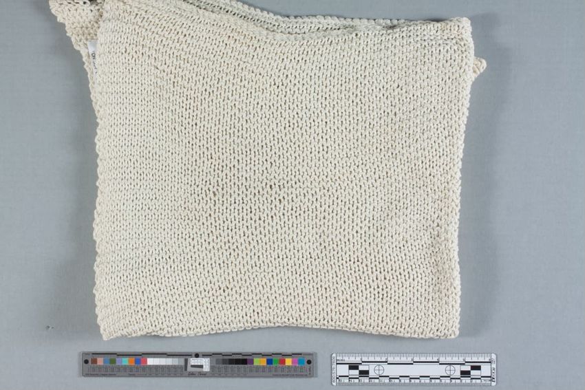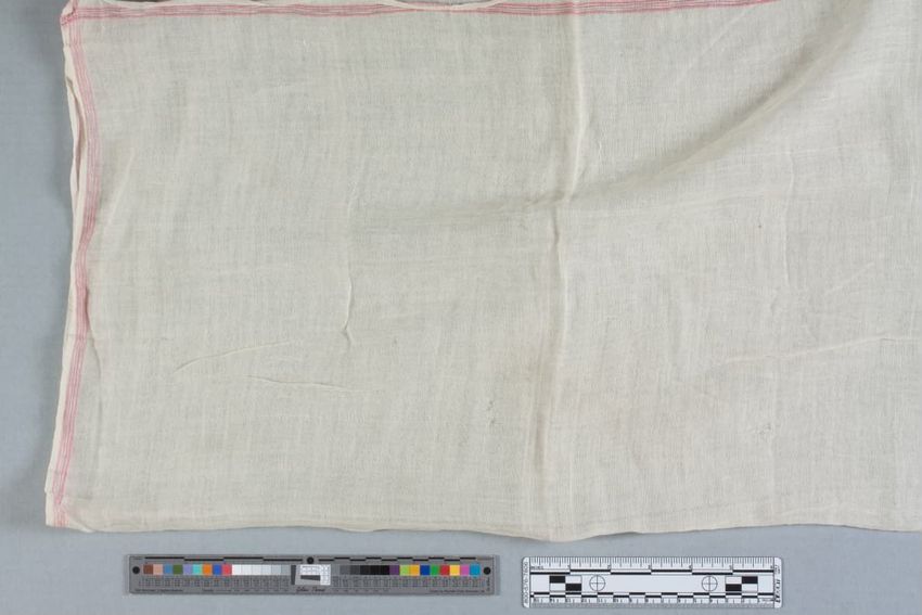 Nearly square, white linen damask; large centerpiece of various fruits including melons, pears, plums, apples, etc. Border of floral bunches; C-scrolls. Double line outer border; floral sprigs between. Hemmed ends; selvage sides.