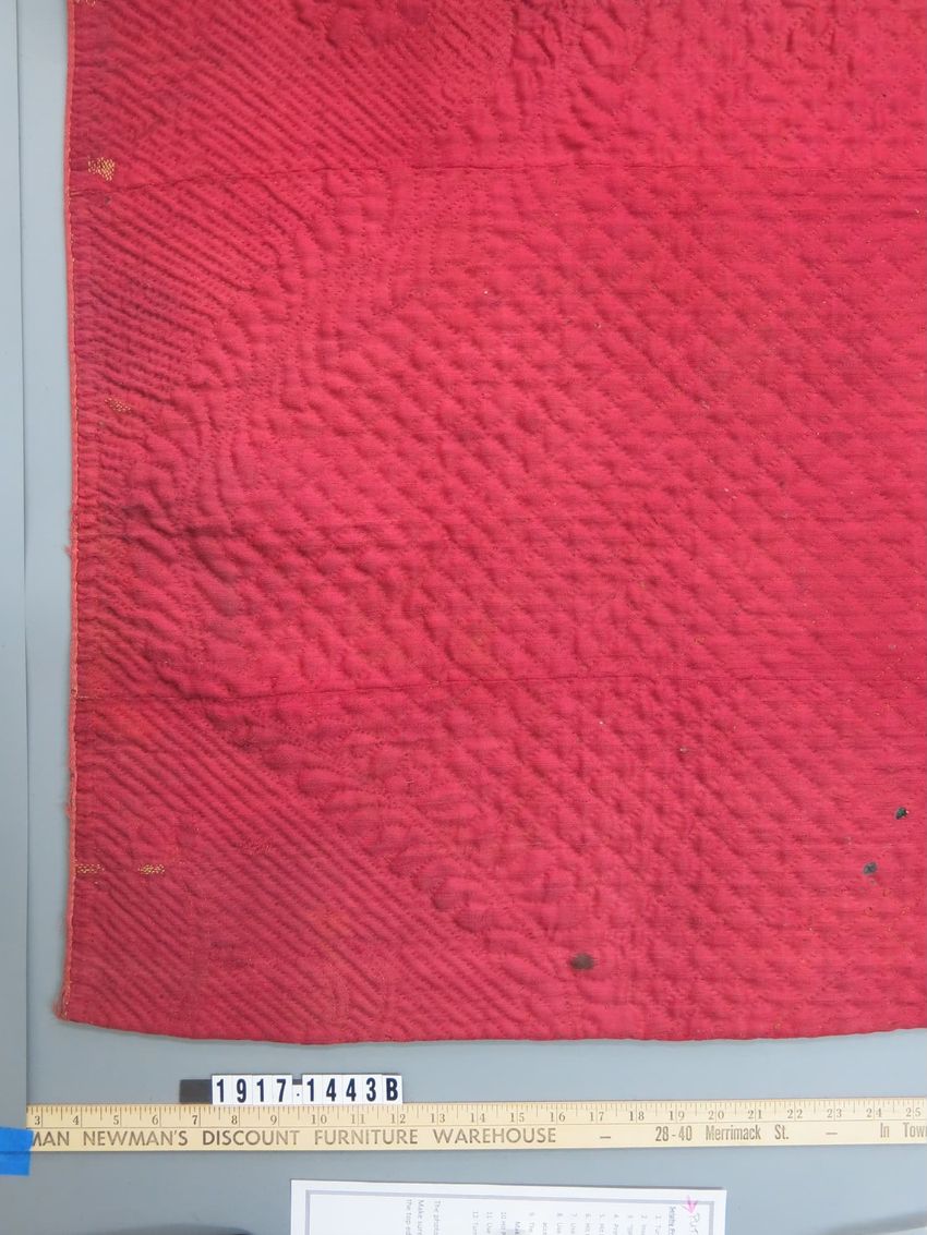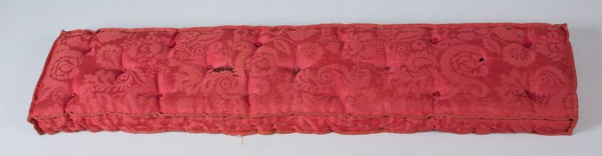 Rectangular cushion; large scale, two-tone red wool damask covering top and sides. Back of coarse yellowish tan linen, filled with horsehair. Edges bound in red woven tape. Top and sides tufted in regular pattern with red wool yarn.