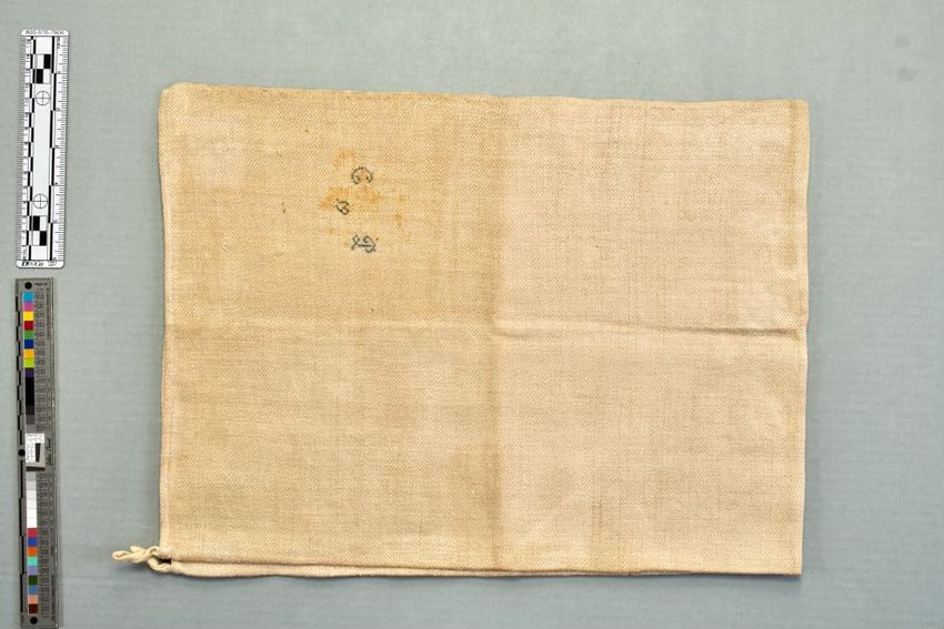 Rectangular, white linen damask; body of alternating rows of diamonds and floral bunches. Sides with running diamond bands and woven red stripe along one side. Across ends three uneven red stripes, the center being the thickest, and diamond patterns. Hemmed ends.