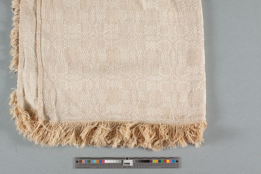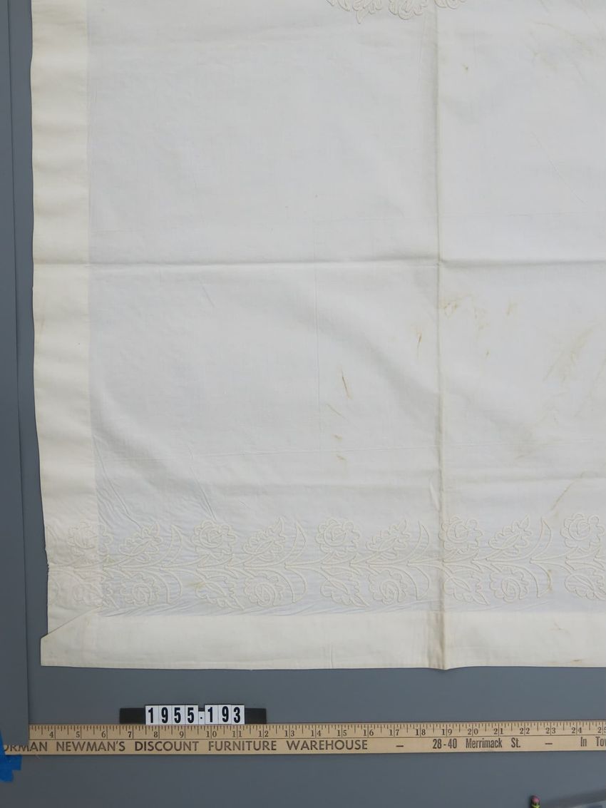 Cream silk faille. Large-scale overall silk embroidery of roses, chrysanthemums, wisteria and lilies in white, pink, lavender and yellow with pale olive leaves. All rising from bed of olive grasses. Edged all around with white silk cord; looped at corners. Pale yellow silk back.