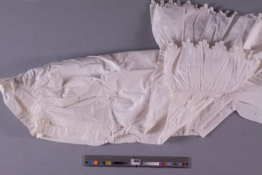 Black silk twill; black lace chemisette with high band collar; black lace at collar and sleeves backed with cream tulle; black silk bands of openwork with geometric pattern of diamonds, squares and ovals - these bands radiate around chemisette, sleeves and hem; vertical tucks full length of dress; b...