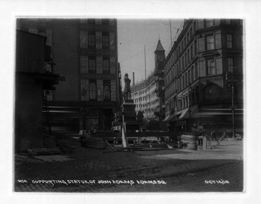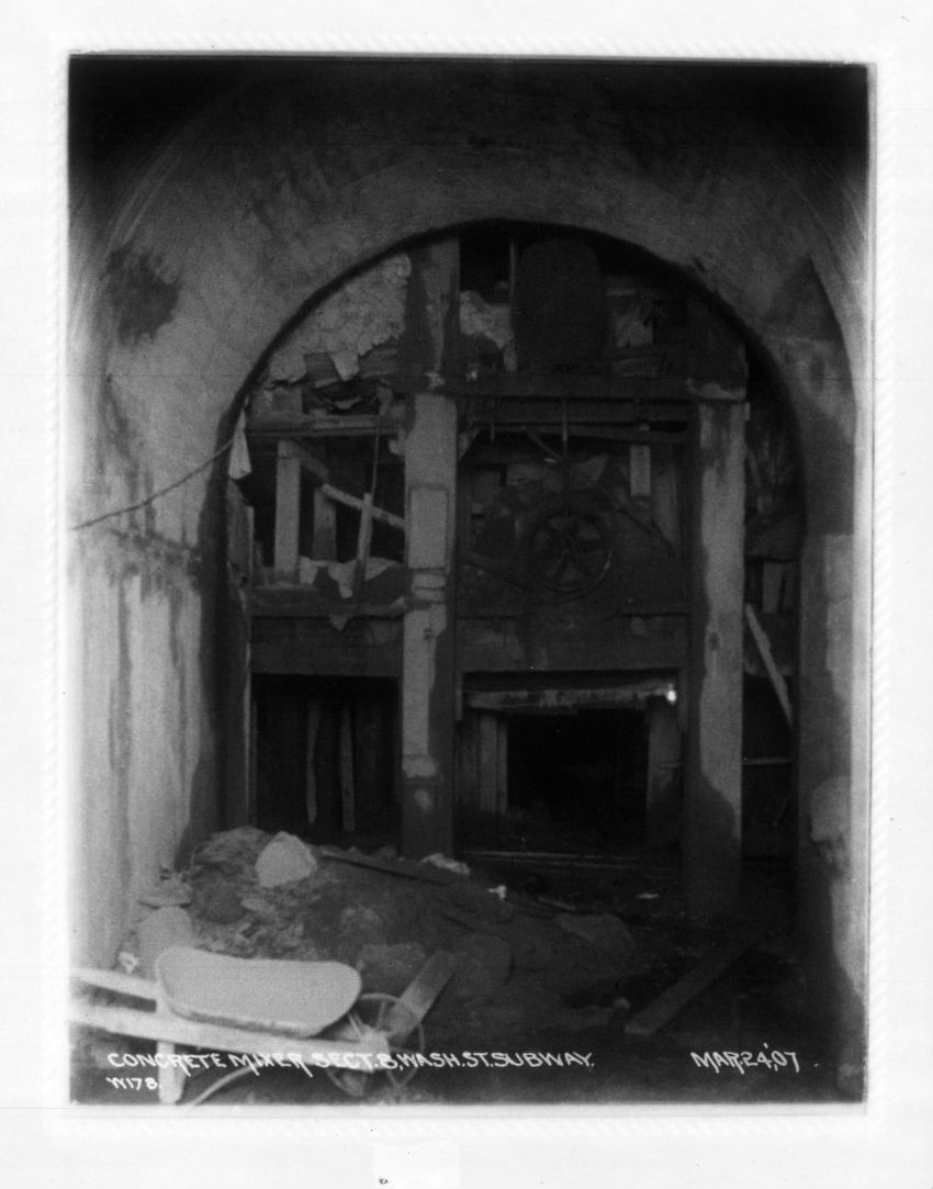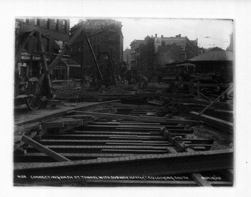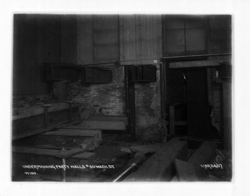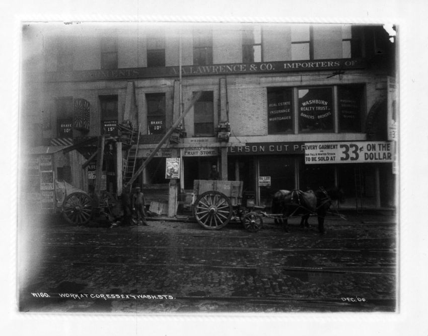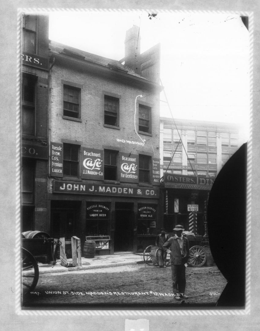 "Beachmont Cafe for gentlemen" is one of the signs above John J. Madden & Co. Signs in the windows at street level read "Roessle Brewery Premium Lager Beer" and "Boston Beer Co's. Reliance Stock Ale." The handwritten text with the arrow reads "Bad masonry."