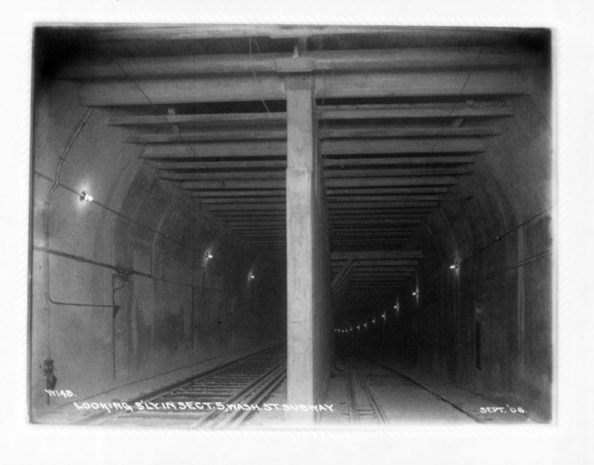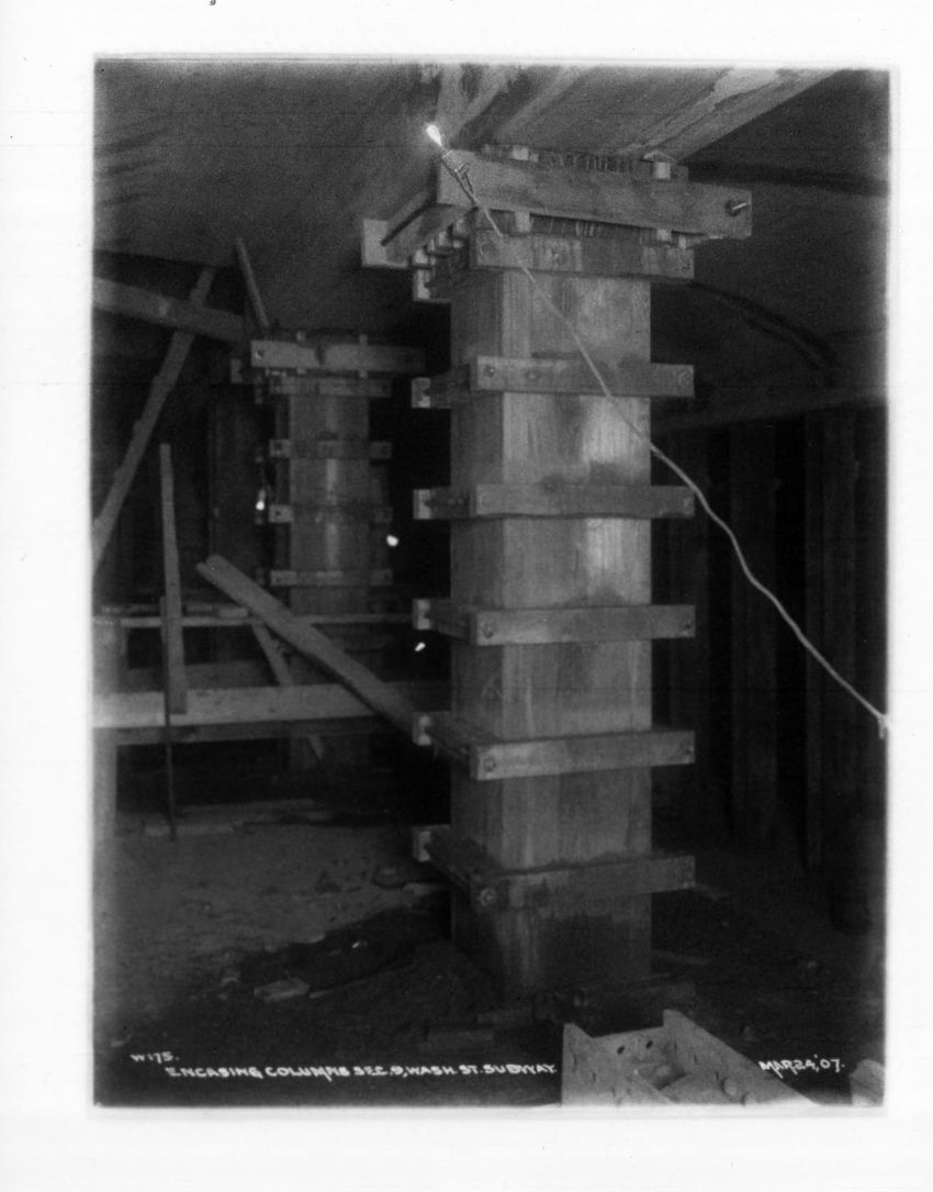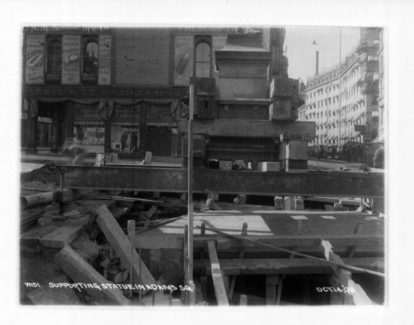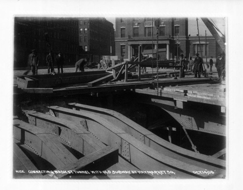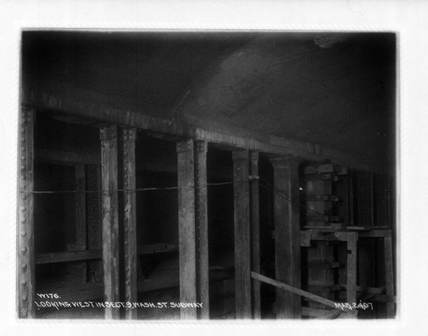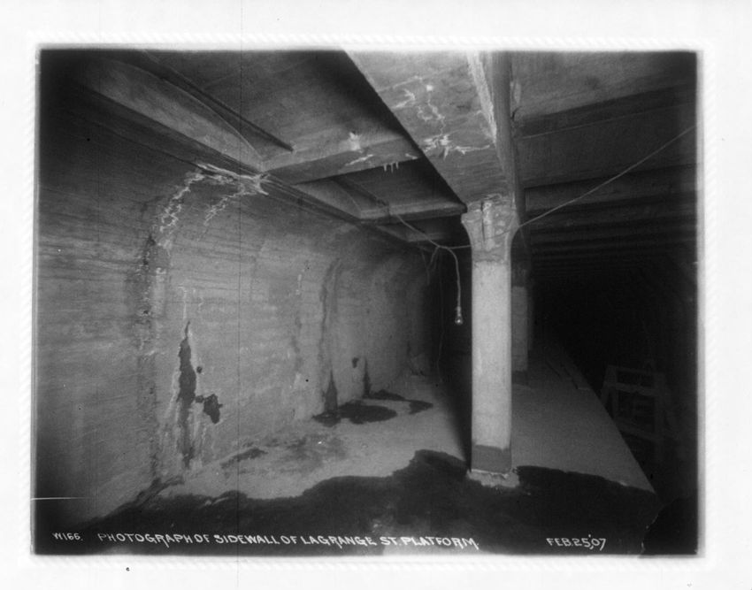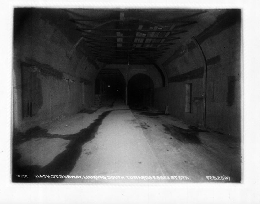 "Beachmont Cafe for gentlemen" is one of the signs above John J. Madden & Co. Signs in the windows at street level read "Roessle Brewery Premium Lager Beer" and "Boston Beer Co's. Reliance Stock Ale." The handwritten text with the arrow reads "Bad masonry."