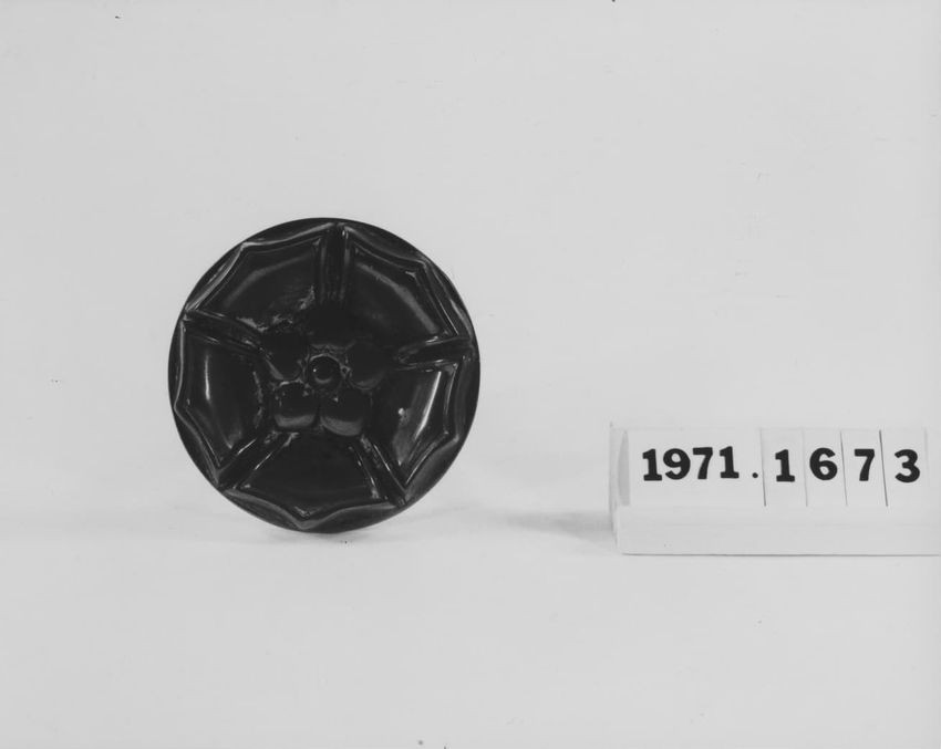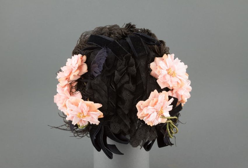 Tan straw; poke bonnet, large; fringed black grosgrain around crown and brim; pleated faille apron; edges bound in black silk twill; long black grosgrain ties; brim faced with white horsehair; paper, cotton and silk roses in pink, red, and yellow clustered at back of brim and along inside of brim.