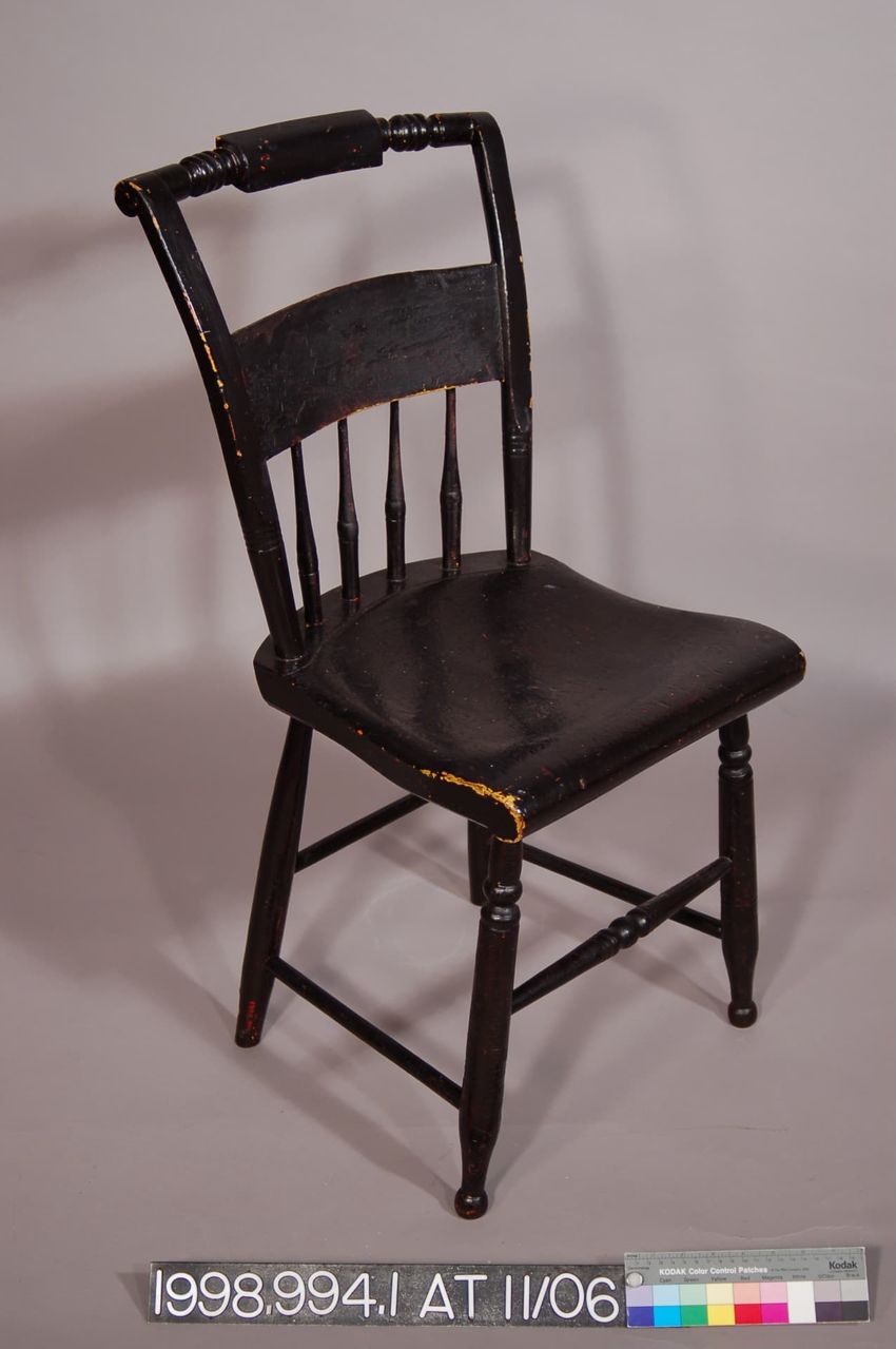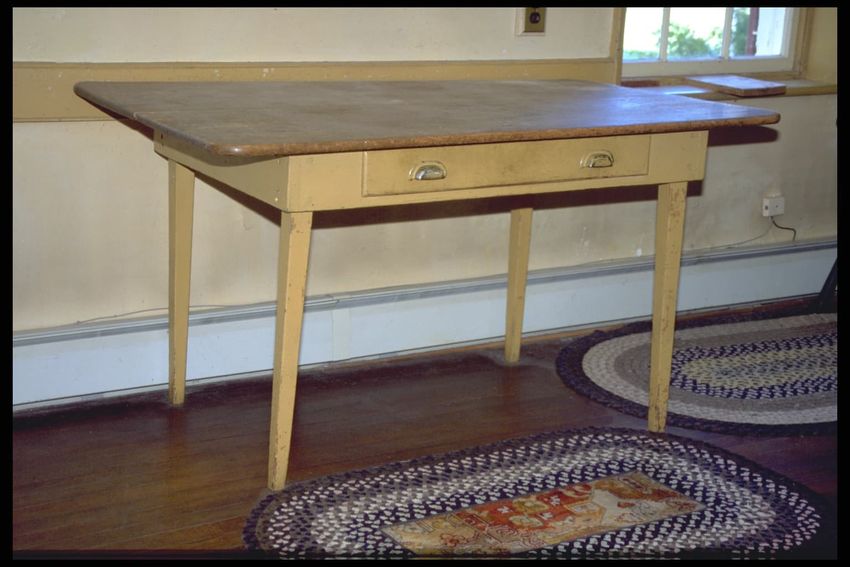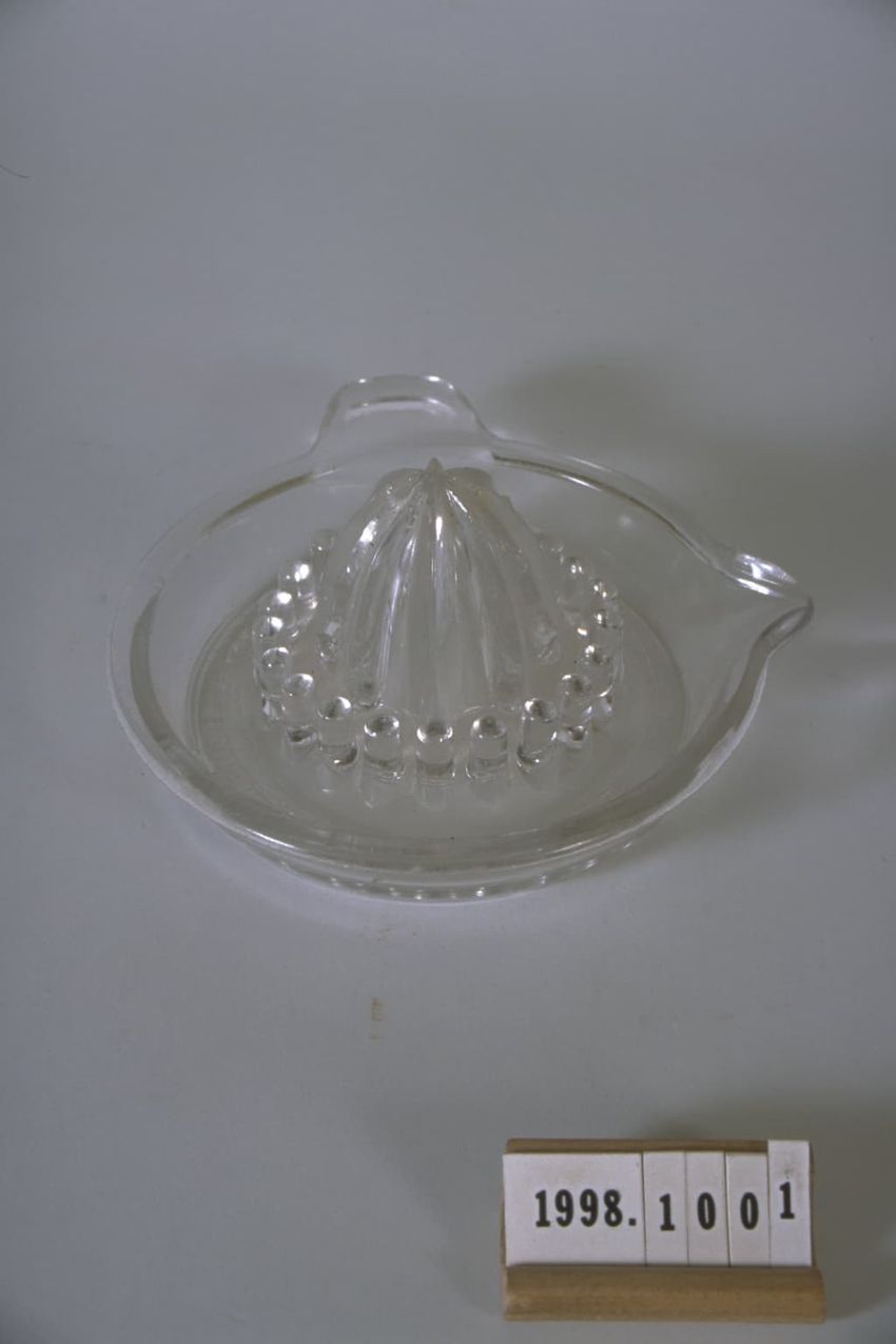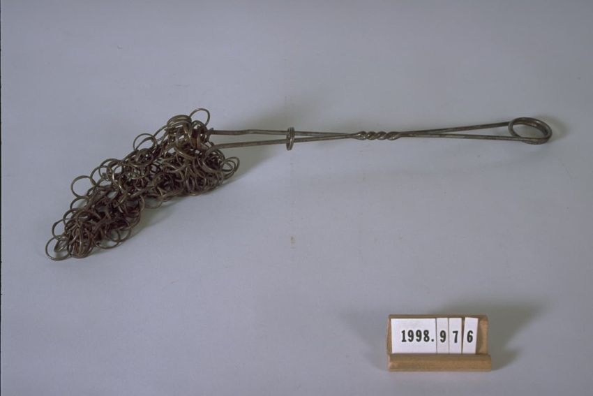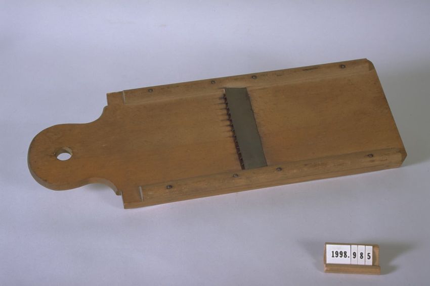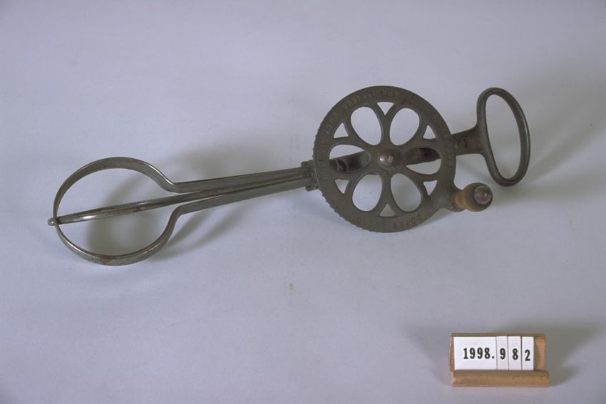 Cast iron apple parer; mechanism w/ handle on side w/ black painted wooden grip; parer consits of three interlocking gears, a corer, a thin blade (for peeling?), a movable arm (possibly for holding the apple), and a clamp at the bottom for attachment to table.