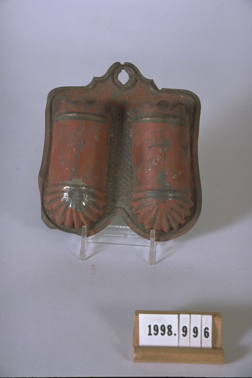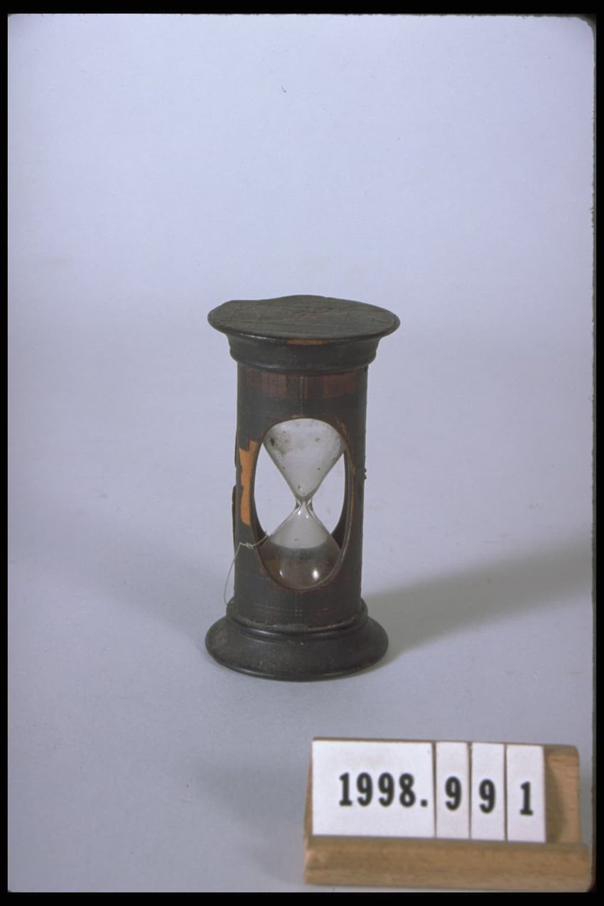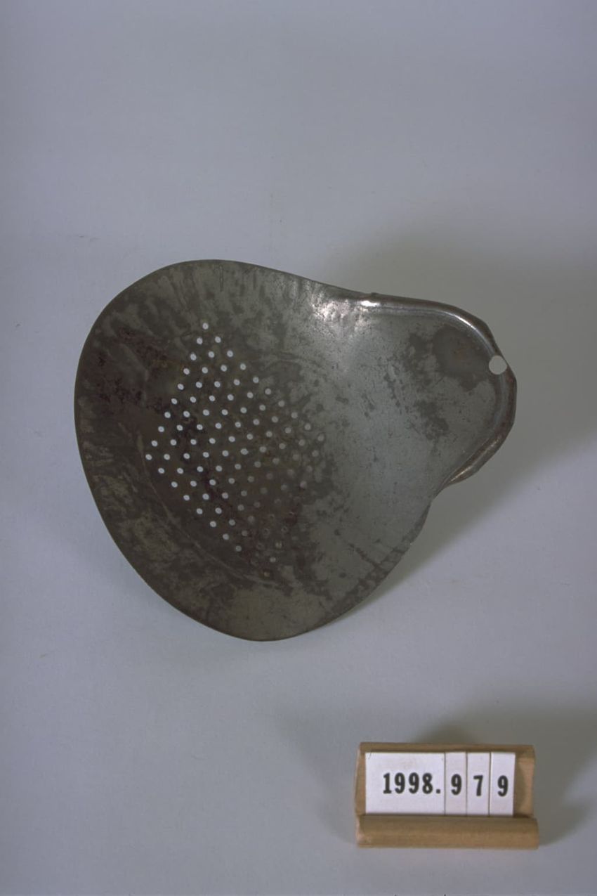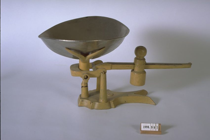 Cast iron apple parer; mechanism w/ handle on side w/ black painted wooden grip; parer consits of three interlocking gears, a corer, a thin blade (for peeling?), a movable arm (possibly for holding the apple), and a clamp at the bottom for attachment to table.