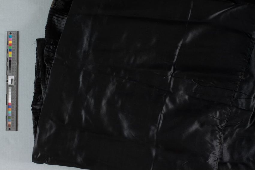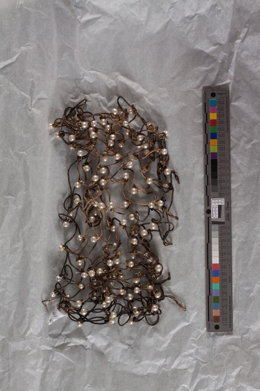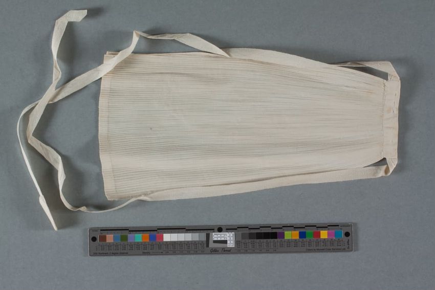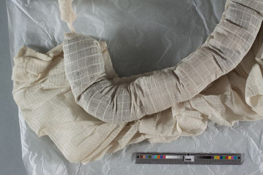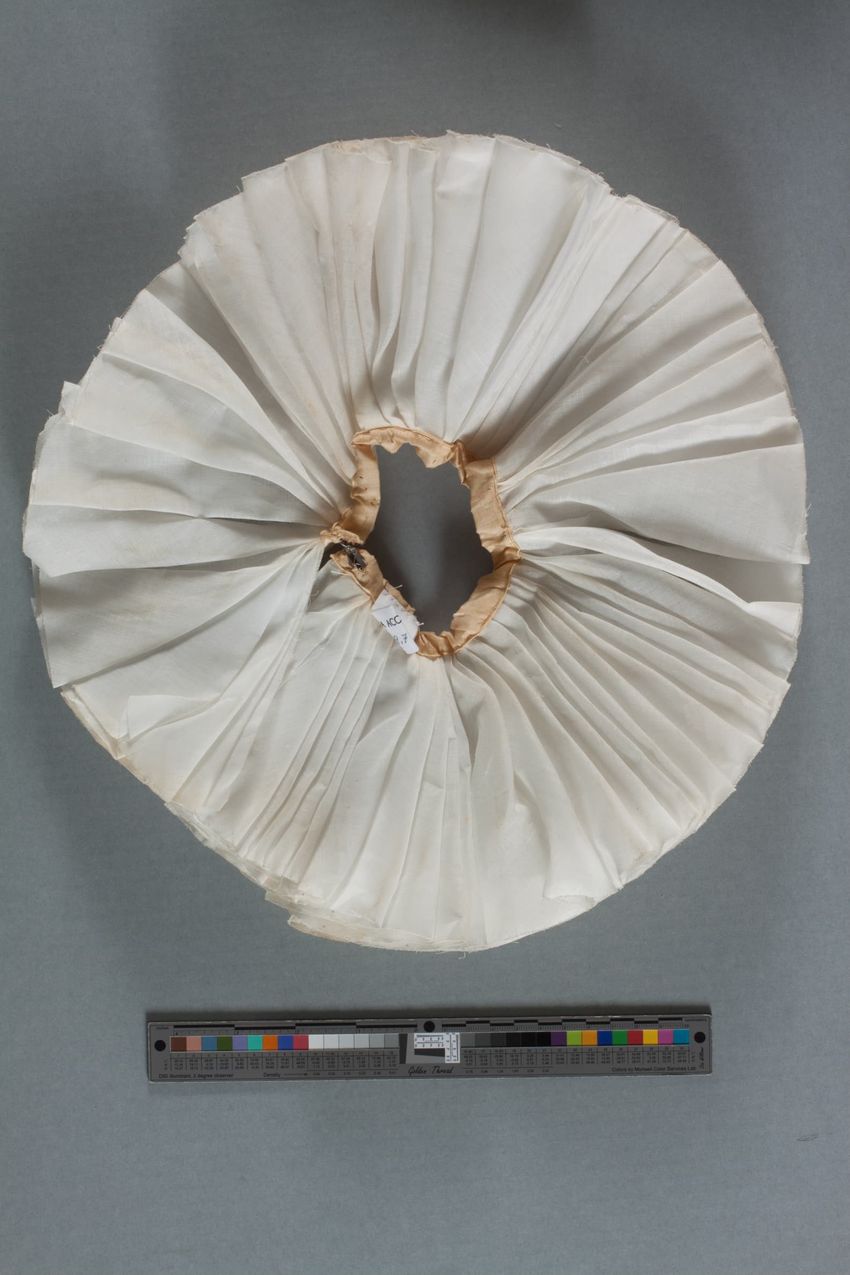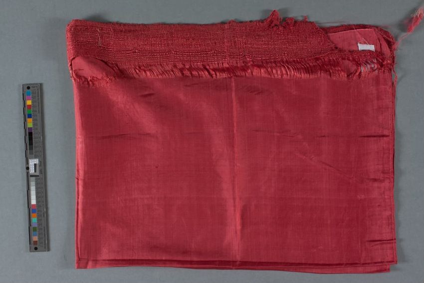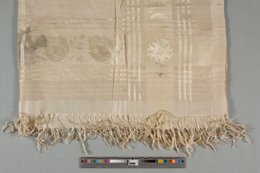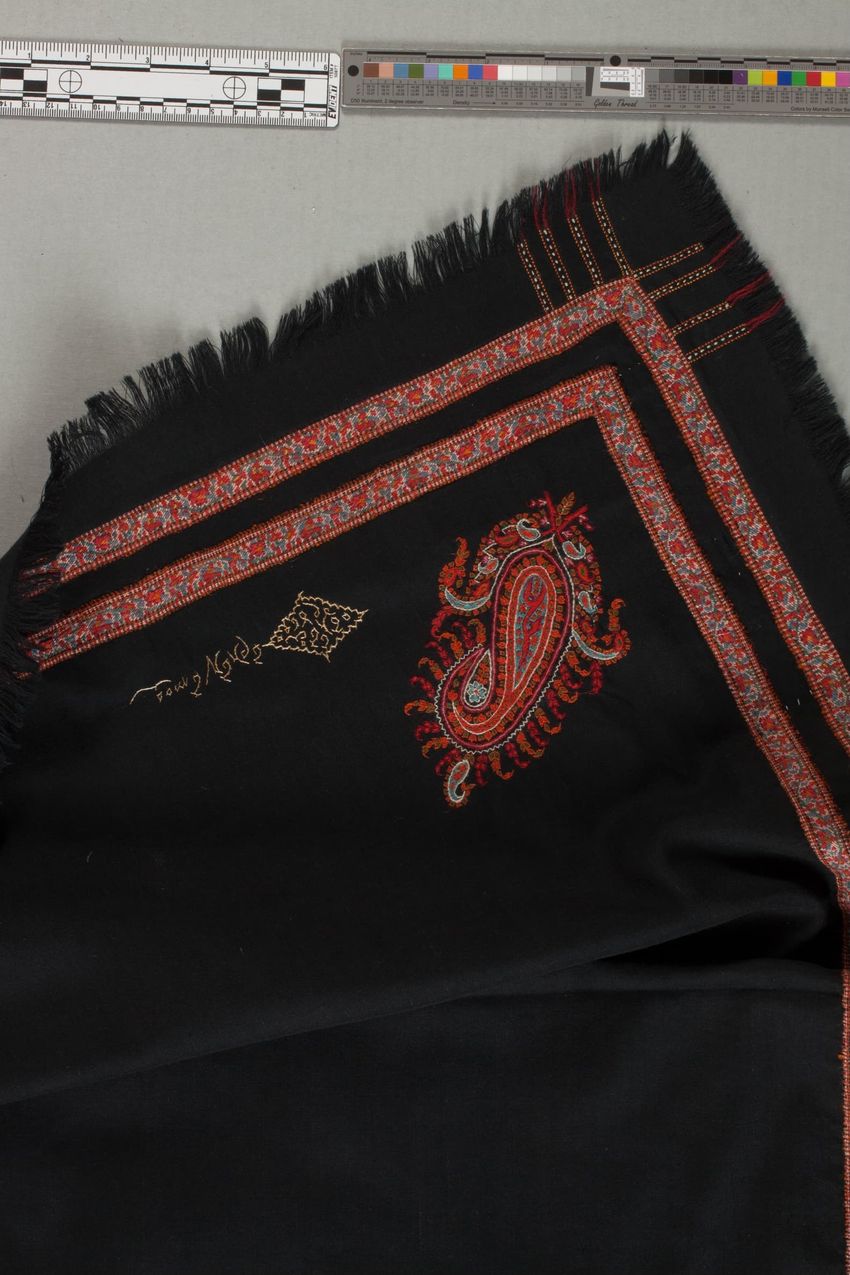 White w/ embroidered border in red, blue, yellow & black; border arranged for shawl to be folded diagonally so that the lower layer hangs below the upper layer to display its 6-1/2" border; upper layer has double border; innermost has separate sewn-on fringe.