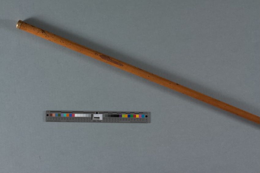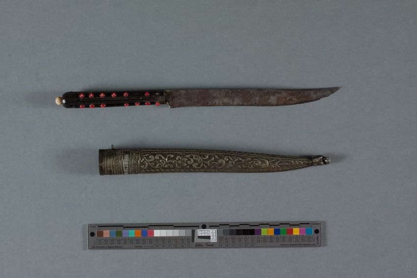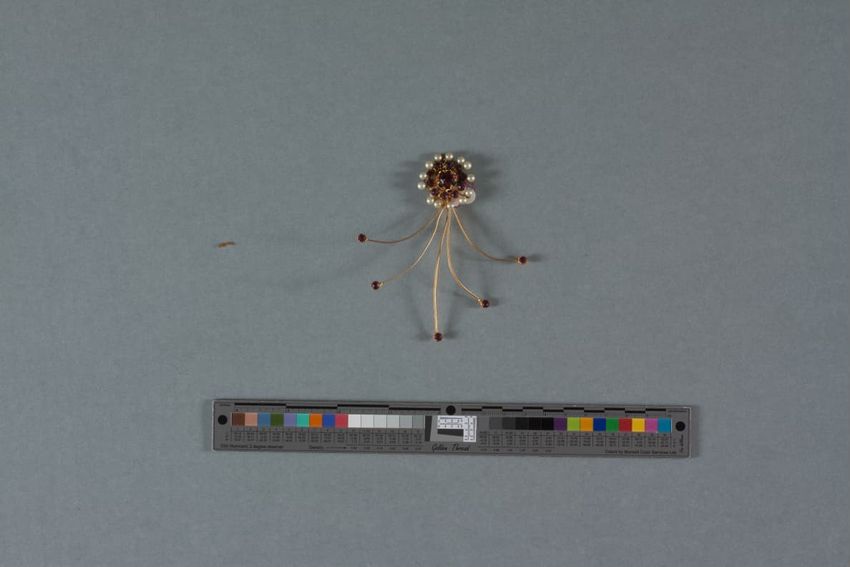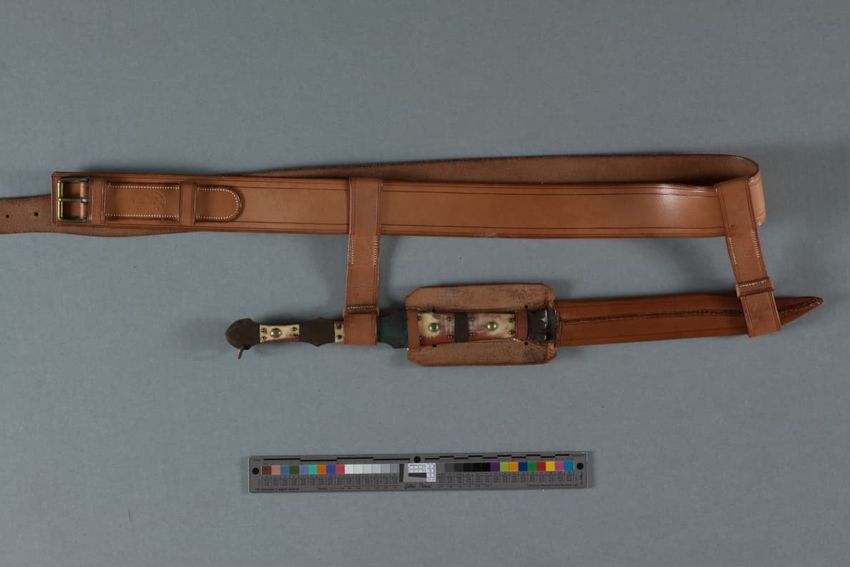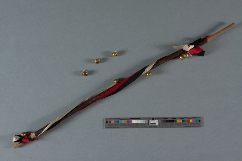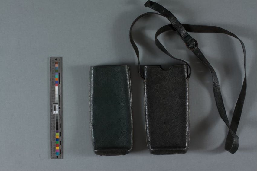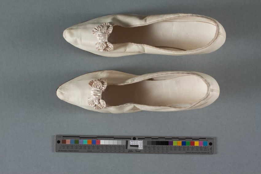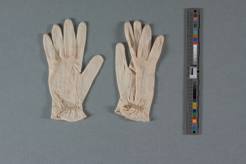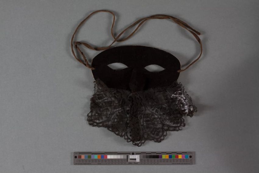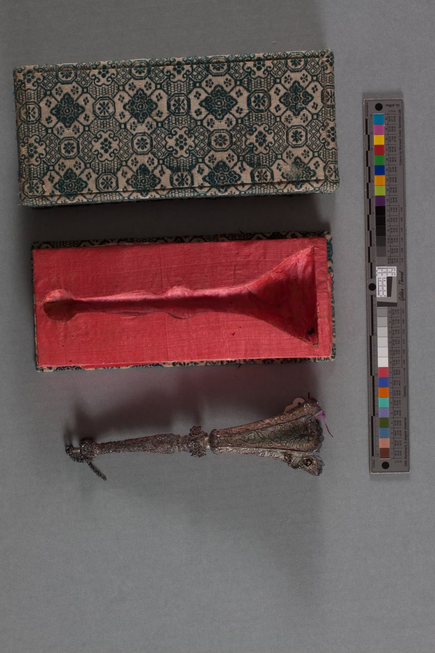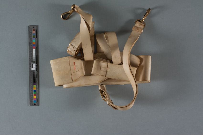 White w/ embroidered border in red, blue, yellow & black; border arranged for shawl to be folded diagonally so that the lower layer hangs below the upper layer to display its 6-1/2" border; upper layer has double border; innermost has separate sewn-on fringe.