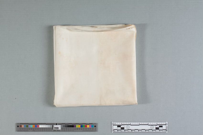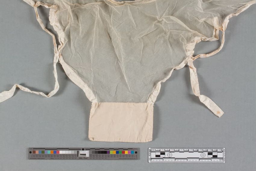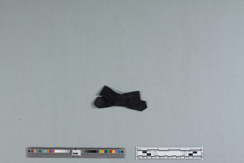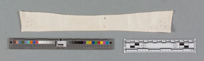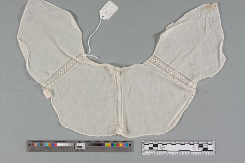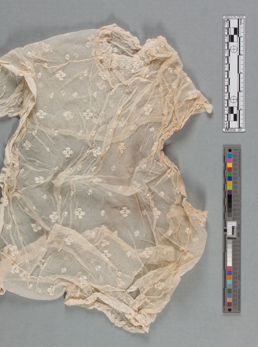 Black silk velvet with wide, notched collar, with square "sailor" style back panel; long sleeves gathered slightly at shoulders; turned back cuffs with velvet button; gathered at back at waist with decorative belt and 2 black velvet buttons; narrow vertical tucks around jacket (resembling gored pane...