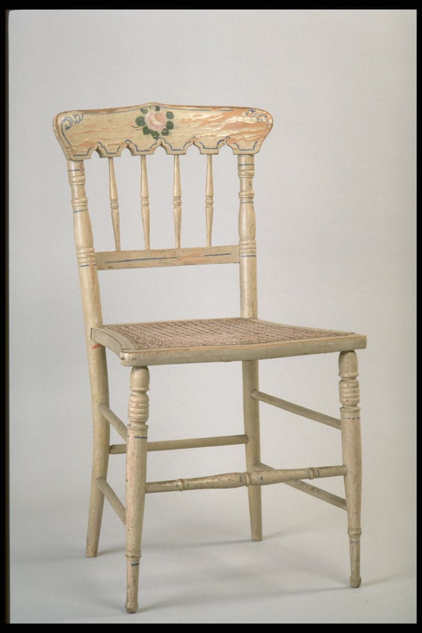 The vase has a circular open mouth with a flat edge on a sloping neck. It has rounded broad shoulders that taper to a narrow circular flat base. It is hand-decorated with a polychrome floral design, striped banding, dot, and zig zag pattern at the foot. It has a reddish-buff colored body with underg...