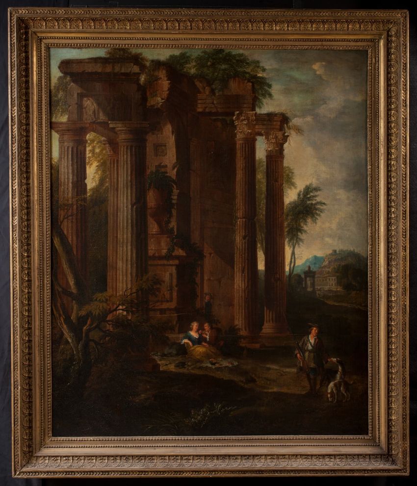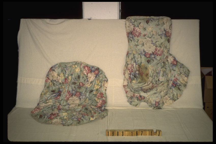 Of a long narrow form with a bright red center, enclosed by an applied border patterned with abstract "peacock" and end panels of paisley cone devices, foliage, flowerheads and banding of various repeated patterns. It is woven in shades of green, orange, blue, pink, white and black. It has red fring...
