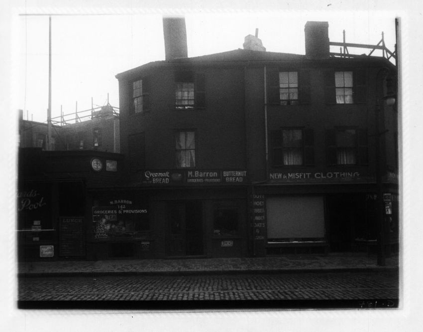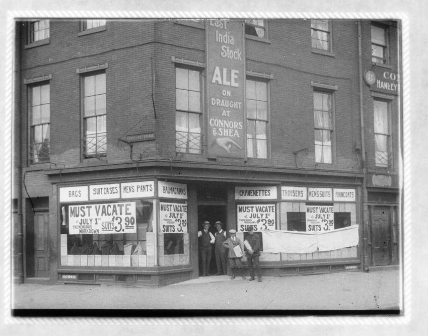 The United Cigar Stores Company store is in the center of the image. Cobb Hersey and Company, grocers and importers, can be seen on the right at 635 Atlantic Avenue. Paperboys are working the sidewalk in front of the stores.