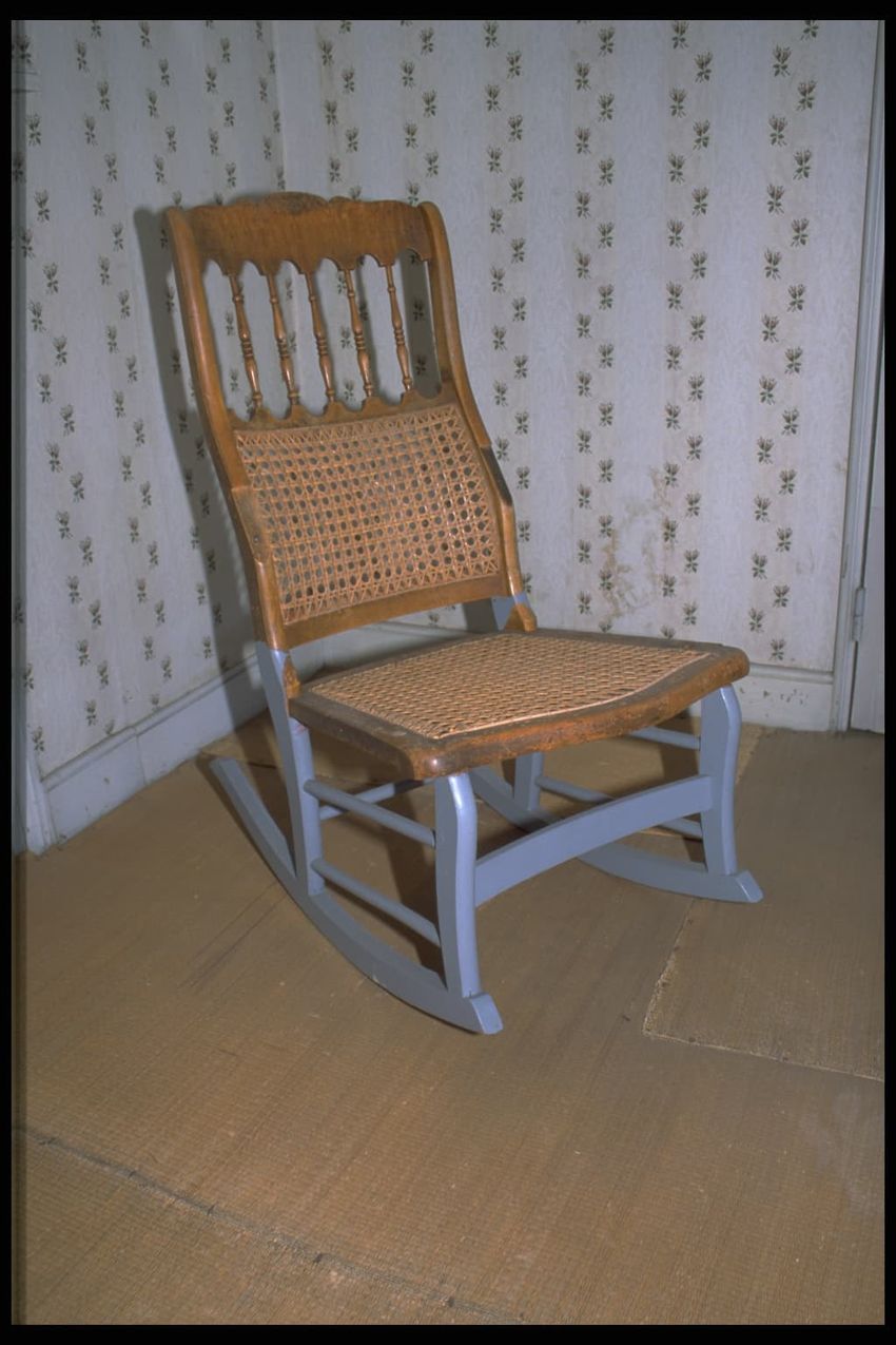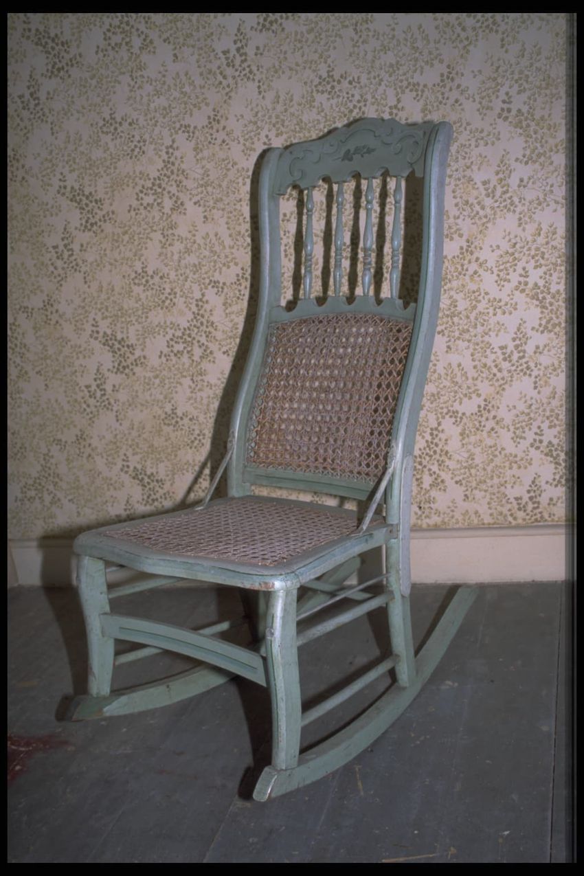 Cottage style rocking chair. Cane seat and lower back ; legs, stretchers, and rockers painted blue. Carved crest rail with four slender turned spindles connected at bottom to the top rail of the caned lower back. Curving stiles, caned seat, slight cabriole front legs, flat concave front stretcher...