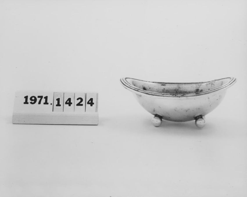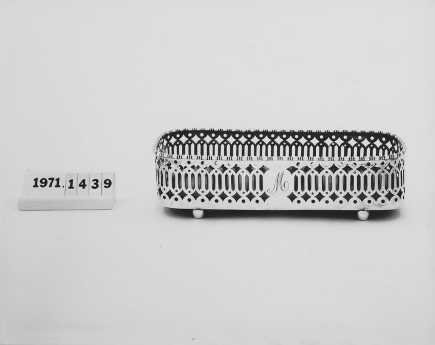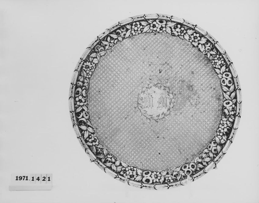Rococco revival hemispherical bowl with 12 uneven flutes, each flute conforming with the pedestal foot. Rim is draping and downturned. 10 of the flutes are machine engraved with vertical floral patterns. The two remaining flutes, which are wider in size, are engraved with a larger floral pattern.