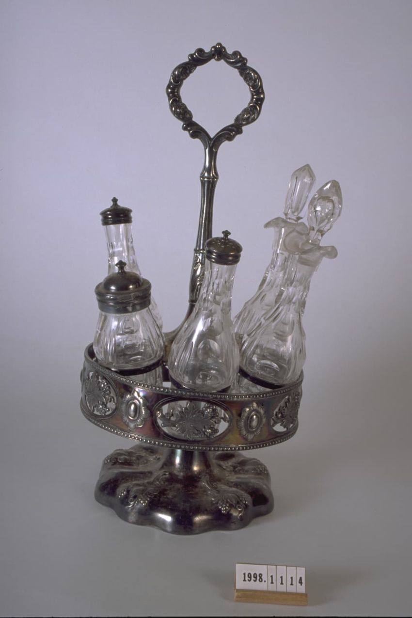 Britannia caster set: stand and 5 cut glass bottles; grapevine decoration on stand; lobed base w/ cut-out design on holder. B & D) Taller bottles--both w/ metal lids. C) Smaller bottle w/ metal lid. E & F) Long neck bottles w/ glass stoppers.