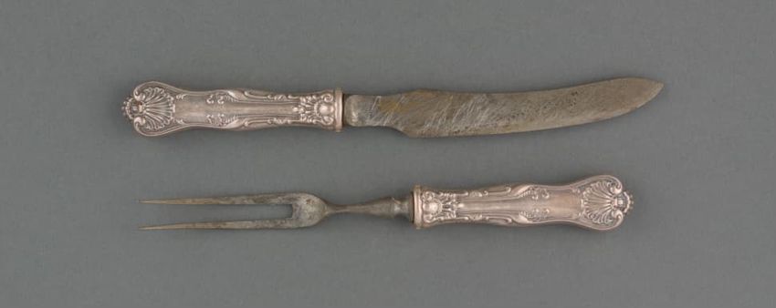 Thin wood gilt frame with scrolled gesso corners. Under glass. Black and white engraving of "John Knox Administering the First Protestant Sacrament, During the Siege of the Castle of St. Andrews, 1547." It is of a scene inside a large hall. In the center foreground are two seated women in white dres...