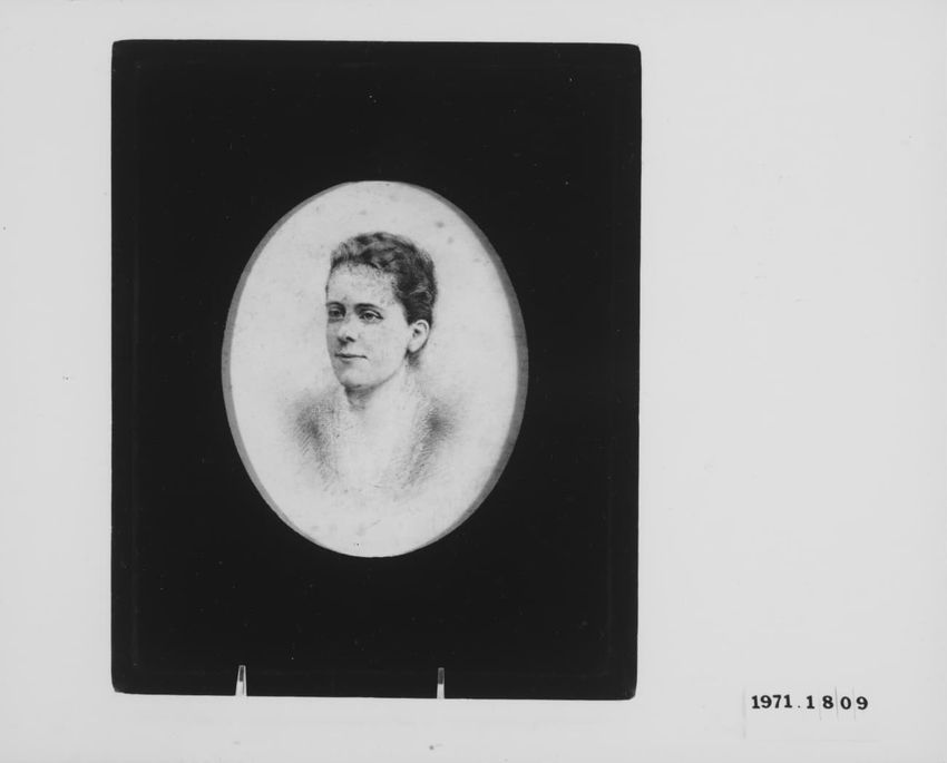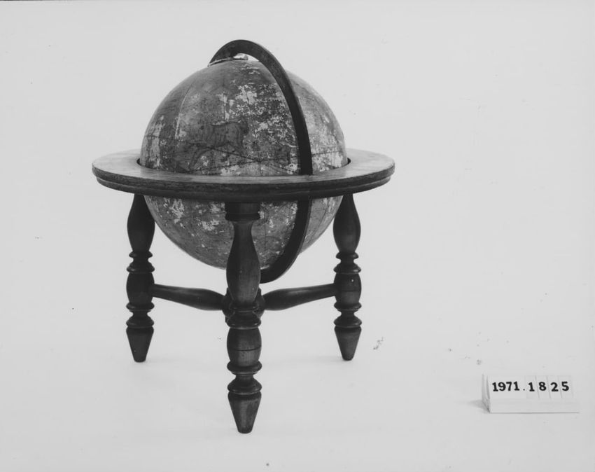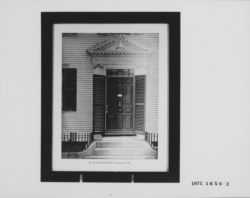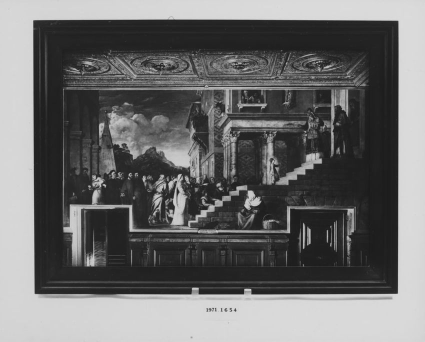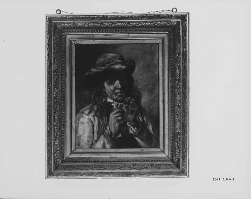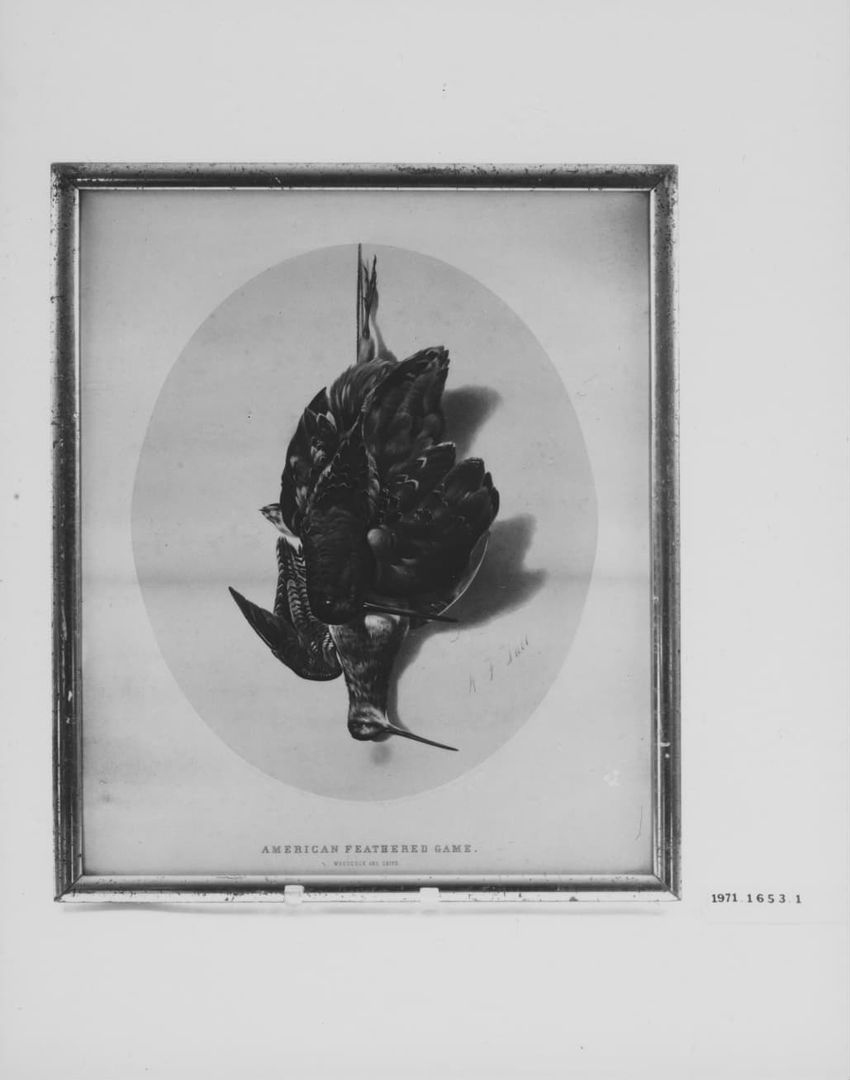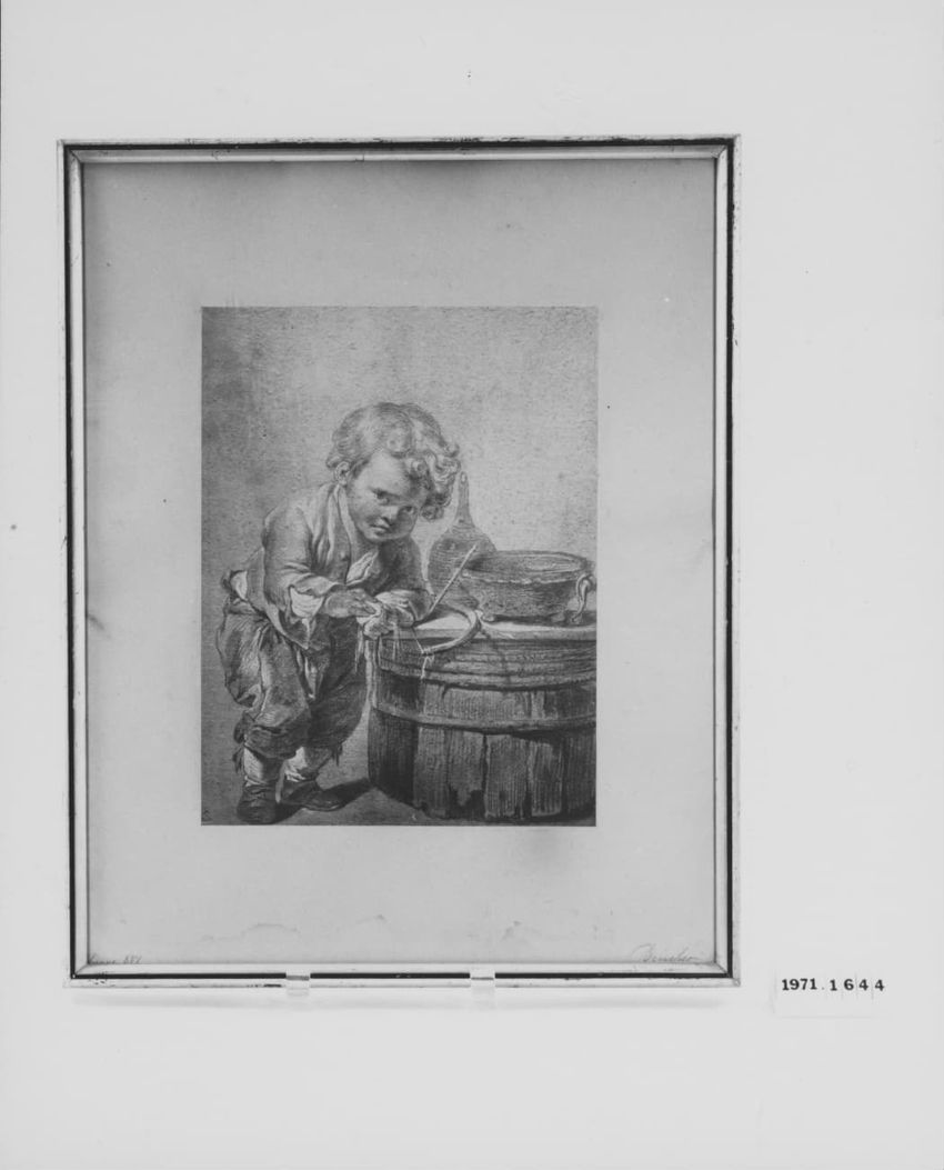 Block print of the countryside on brown paper. A stone fence, at the right, in the foreground with nearby women tending a flock of grazing sheep. A stream, at the left, leads to a small town in the distance with a windmill atop the hill. Three part wood frame with an outer edge in acanthus leaf moti...