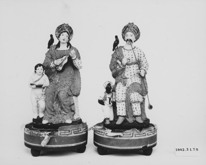 Mutli-color figurine of a seated woman wearing middle eastern garb holding a parrot. Under a glass bell jar. One of a pair.
