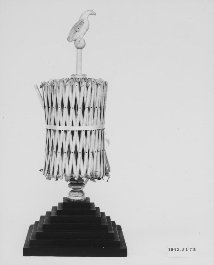 Swift made of ivory held together with nails and ribbons on a stepped wooden base with a carved eagle finial at the top.
