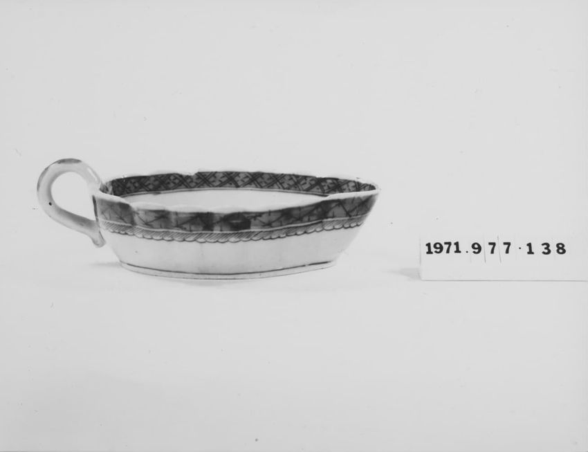 Cream-colored silk netted lace pelerine with a scalloped edge and a meanering border at hem and floral border at neck. Lappets at front, triangular shape at back, seamed at thee shoulders. Decorated with applied, cream-colored, blue-edged silk taffeta rosettes in two sizes. Net is dotted, closure is...