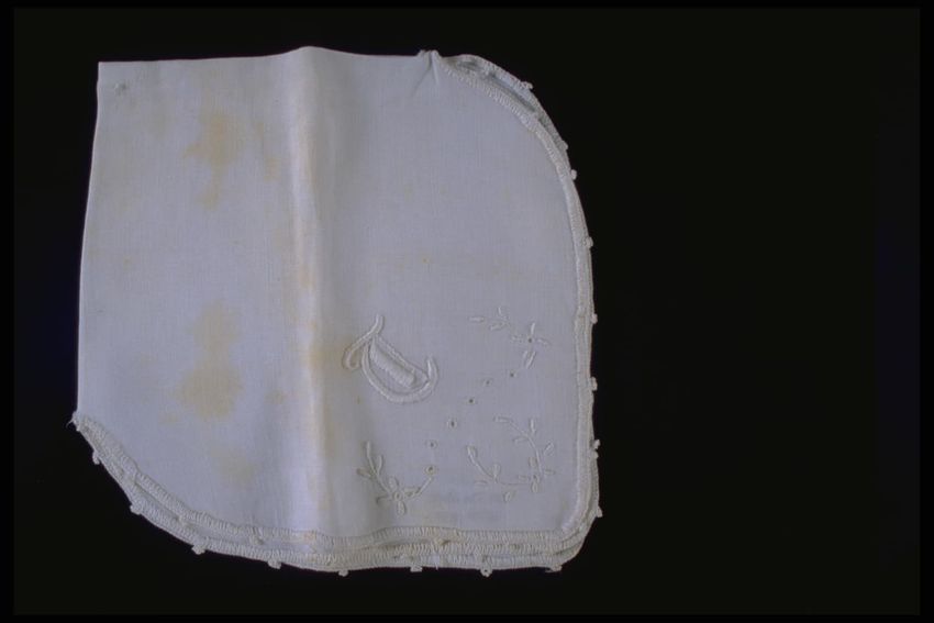 White line damask napkin; large circle in center w/ foliate trail rings inside circle; stemmed roses also inside circle; corners w/ foliate trail decoration.