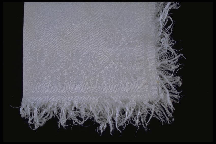 Linen napkin case w/ blue embroidered "T"; square in center w/ cardboard insert and 4 flaps which fold into center to form a cover; 2 flaps pointed at ends; case is white w/ blue banding around edges.