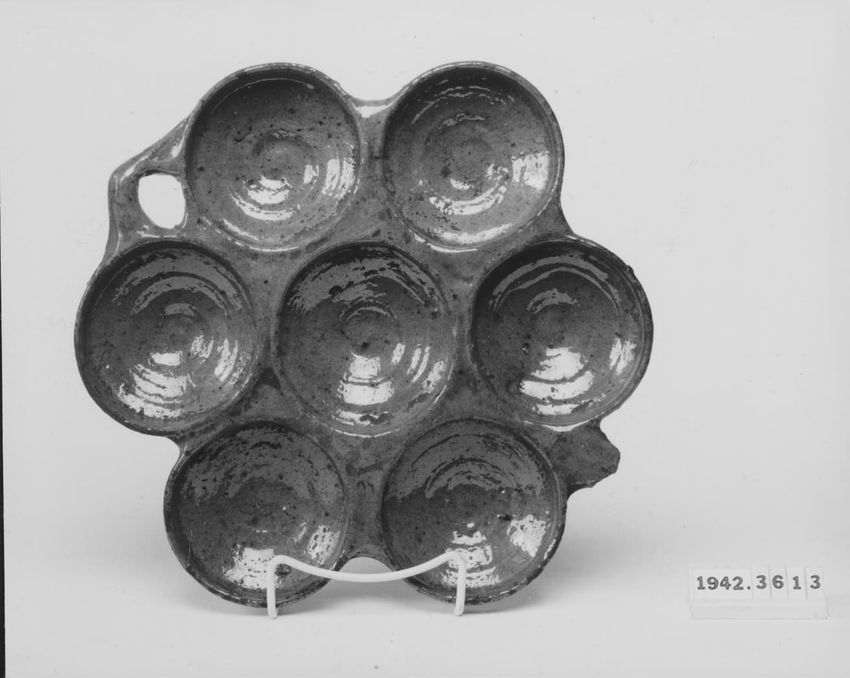 Red-brown, green, and yellow dish with a notched edge, deep well, and slip decoration.