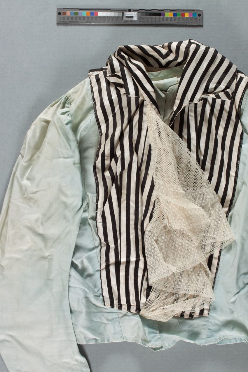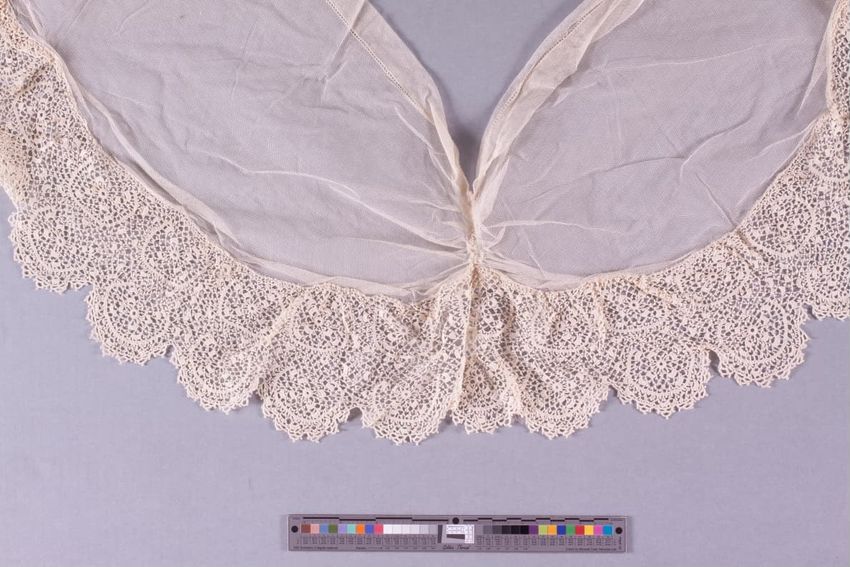 3/4 length; cream-colored coarse linen; V-neckline; notched waist with cutaway front below waist; bands of lace and filet crochet inserted along center front, sleeves, side seam and hem. Cutwork pattern of circles, "U" shapes, ovals/abstract shapes all over; short sleeves; 3/4 length jacket; four c...