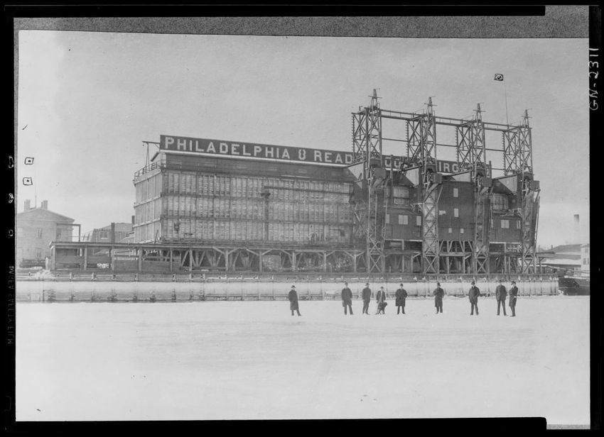 The image shows the Merrimac River frozen over at Coal Pocket in Newburyport, Massachusetts. A group of people stand on the frozen surface, with an industrial structure labeled "Philadelphia & Reading Coal & Iron" visible in the background.