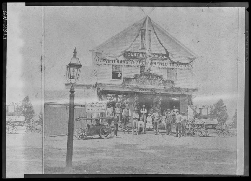 The image shows a group of people standing in front of Little's Old Store on the corner of Parker Street in Newbury, Massachusetts. The building has signs that read "Country Produce," "Veterans of '76 Remembered to Date," and "Post Office." The first man on the left is identified as Charles Lunt's f...