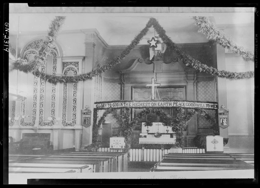 The image shows the interior of St. Paul's Episcopal Church in Newburyport, Massachusetts, decorated for the Christmas season. The altar is adorned with greenery and a banner reading "Glory to God in the Highest on Earth Peace Good Will to Men." Pews are visible in the foreground, and the space is f...