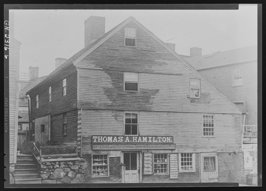 The image depicts the Benaiah Titcomb House located in Newburyport, Massachusetts. The building is wooden with multiple windows and a visible chimney. A sign on the front reads "THOMAS A. HAMILTON," advertising paints, oils, glass, putty, varnish, turpentine, benzine, brushes, and colors. The struct...