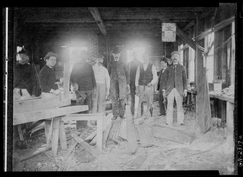 The image depicts the interior of Bowen's Boat Shop in Newburyport, Massachusetts. Several men are standing in a workshop surrounded by wooden planks, tools, and workbenches, with scattered wood shavings on the floor.