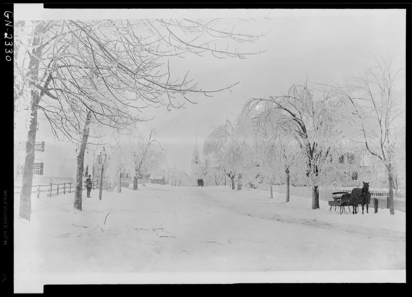The image depicts a snowy scene on High Street looking east from Bromfield Street in Newburyport, Massachusetts. Trees lining the street are covered in snow, a horse-drawn carriage is visible on the right, and a church steeple can be seen in the distance. A person is walking along the left side of t...
