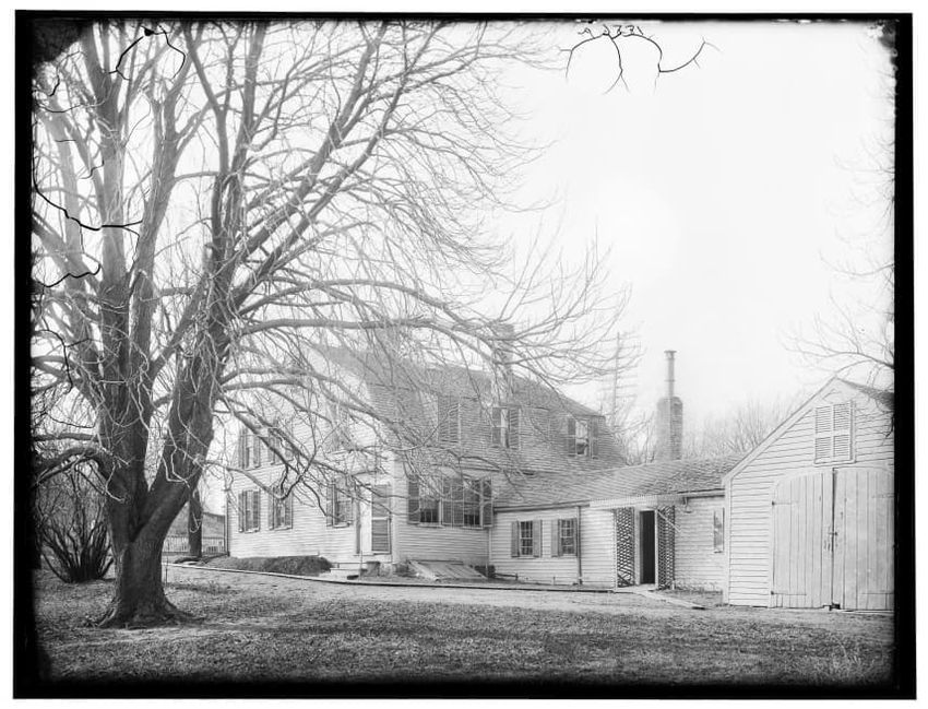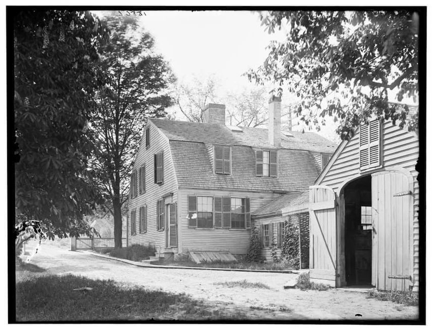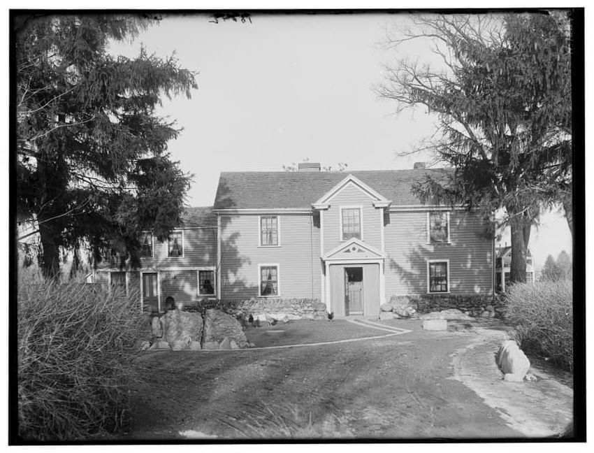The image depicts Buckman Tavern, a historic building located in Lexington, Massachusetts. It is a large wooden structure with multiple windows, shutters, and dormer windows on the roof. A prominent door is situated at the center, flanked by a small porch. Leafless trees are visible in the foregroun...