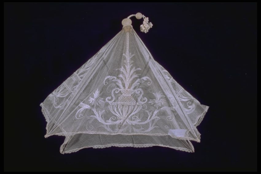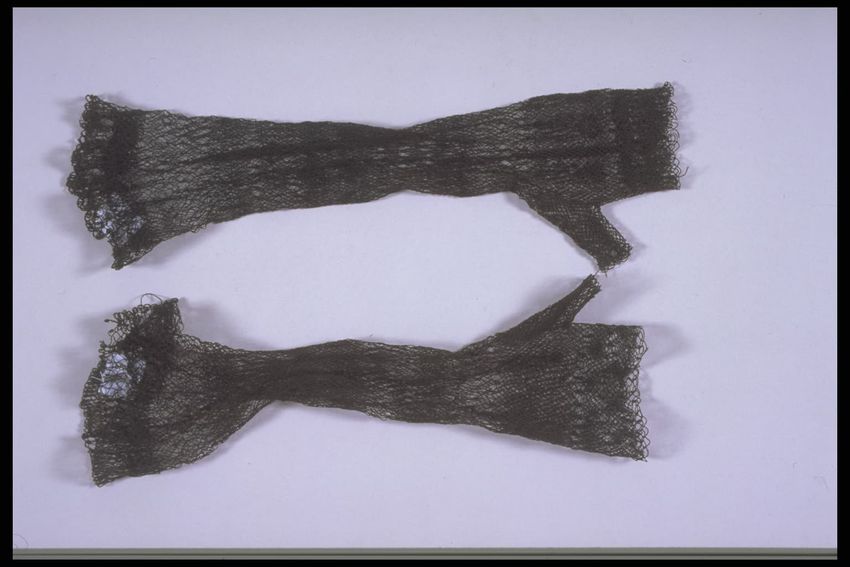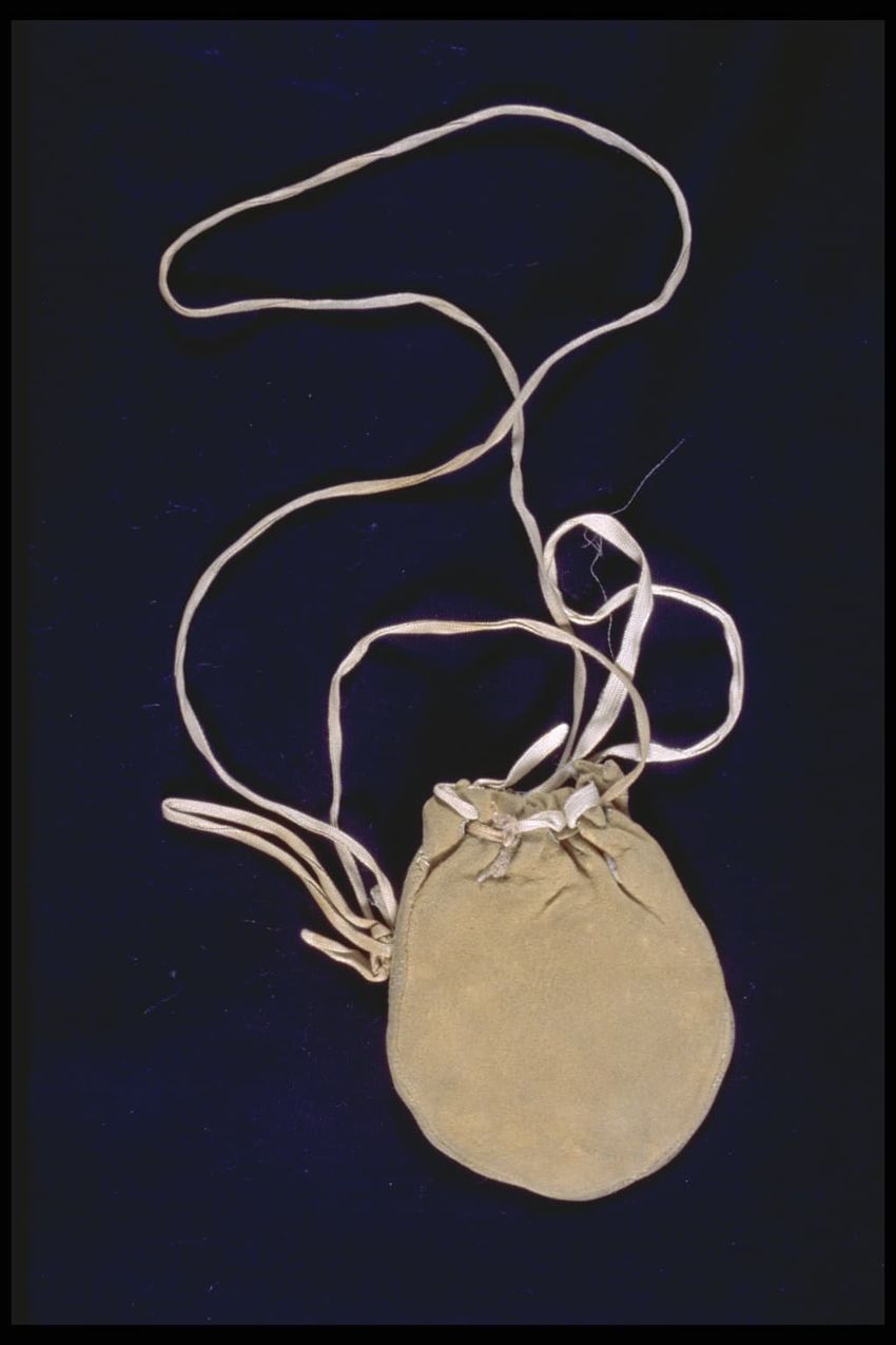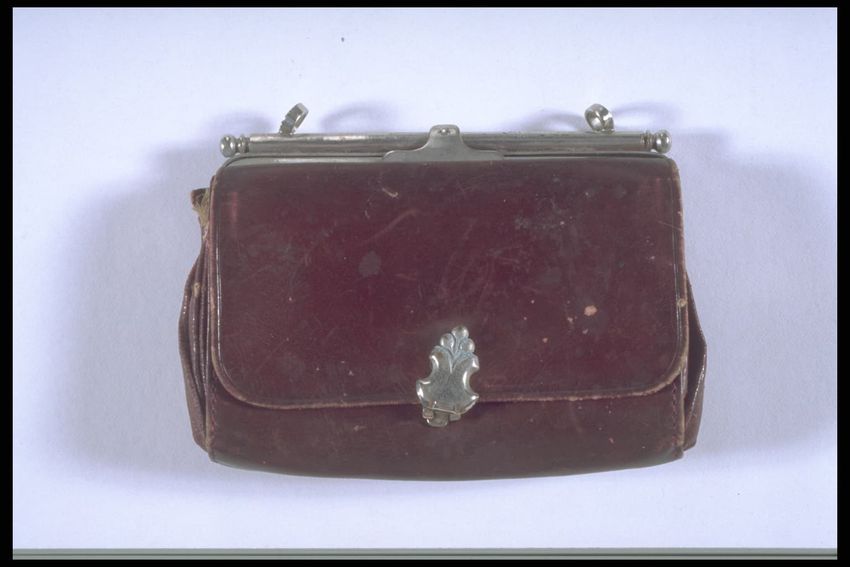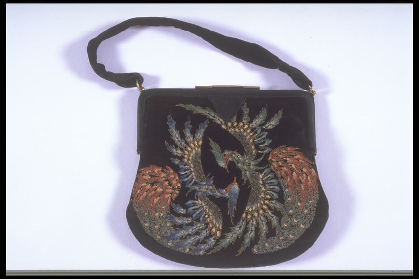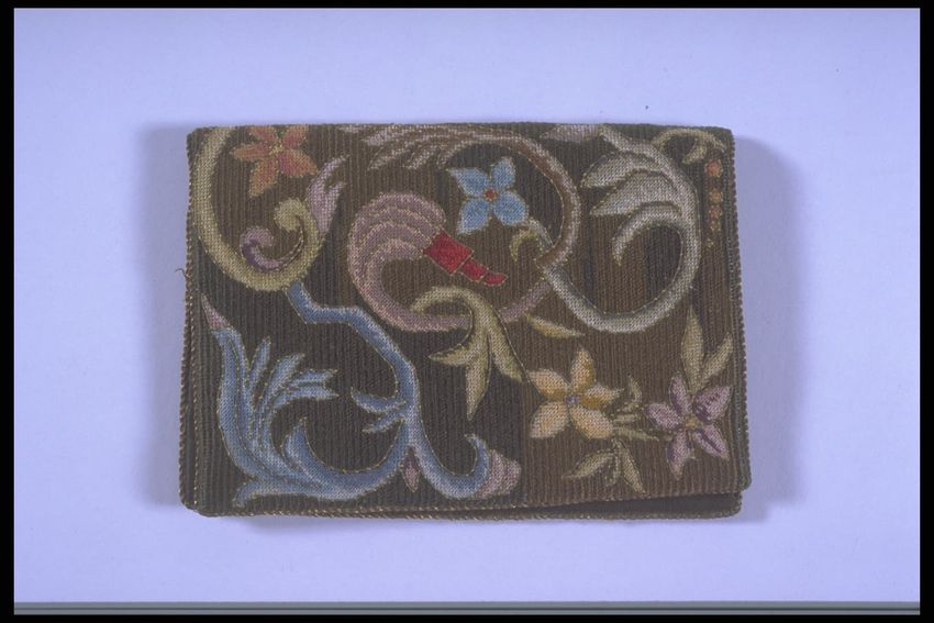 Green woven wallet, one fold, satin lining inside w/ 2 pockets. Outer design--abstract floral and vines, blue, yellow, purple, green. Edged in gold braiding.
