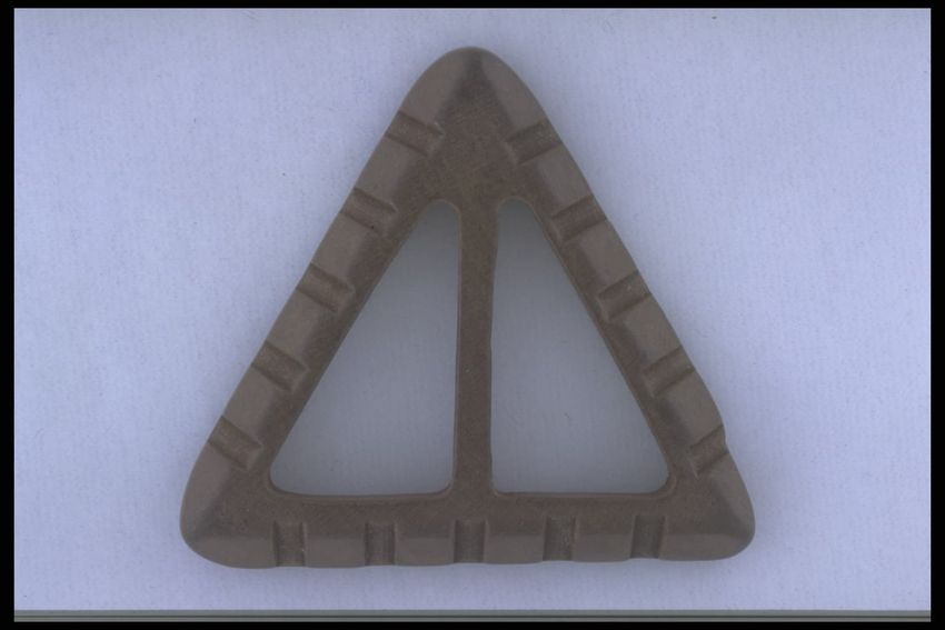 Triangular-shaped buckle cut from a single piece of wood with a cross piece bisecting the triangle. Outer edges embellished with regularly spaced dentate carving. Marked with location of manufacture on back [See Inscriptions].
