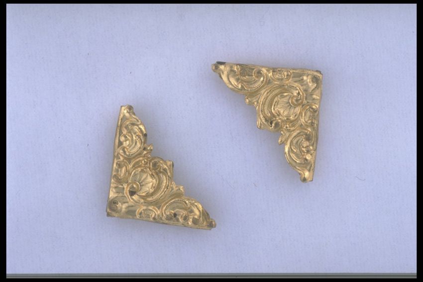 Pair of stamped metal collar tips. Each tip is formed from metal stamped into a hollow, triangular shape with embossed scrolled foliate and clamshell decoration; lip on back to attach to collar. Each tip is plated in gold-colored metal.
