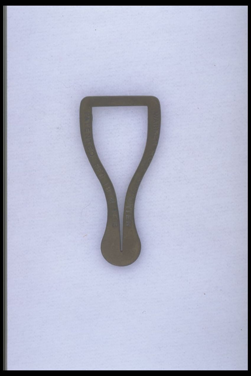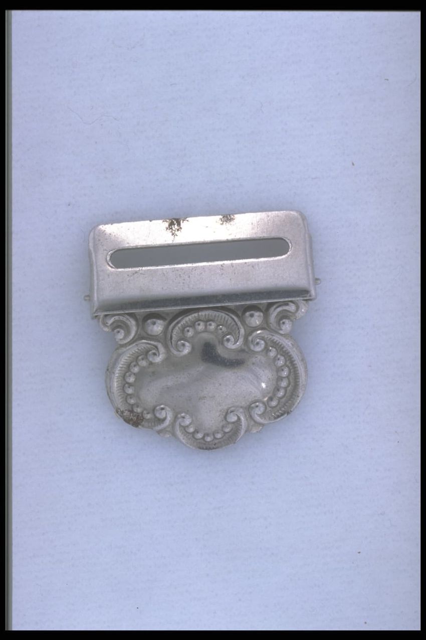 Brass-colored metal portion of a garter clip used to support suspenders or hose. Flat metal ribbon formed in a half hourglass shape with an open center and stamped inscription [see Inscriptions]. Meant to attach to an elasticized band at flat end (no longer extant).
