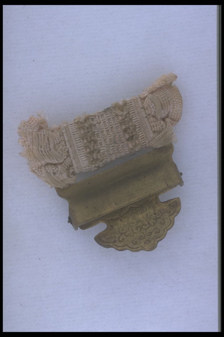 Brass-colored metal clasp with a fragment of pink, ruffle-edged woven strap attached. Clasp consists of a flat, hinged bar and triangular attachment element with pronged teeth for gripping. Pressing on bar places tension on teeth, locking the clasp in place. Triangular element decorated with abstrac...