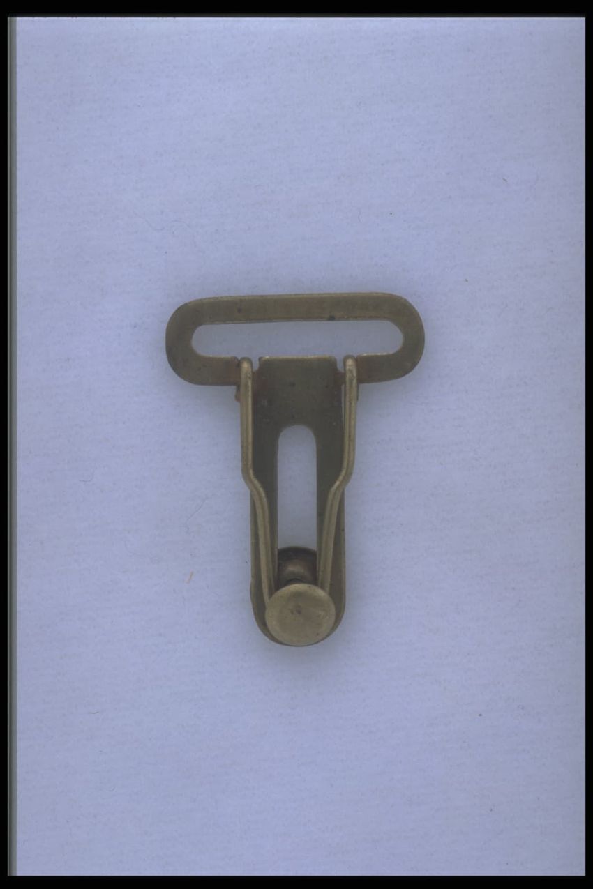T-shaped flat, brass-colored metal clothing clip with wire fastener hinged to flip over sliding button.